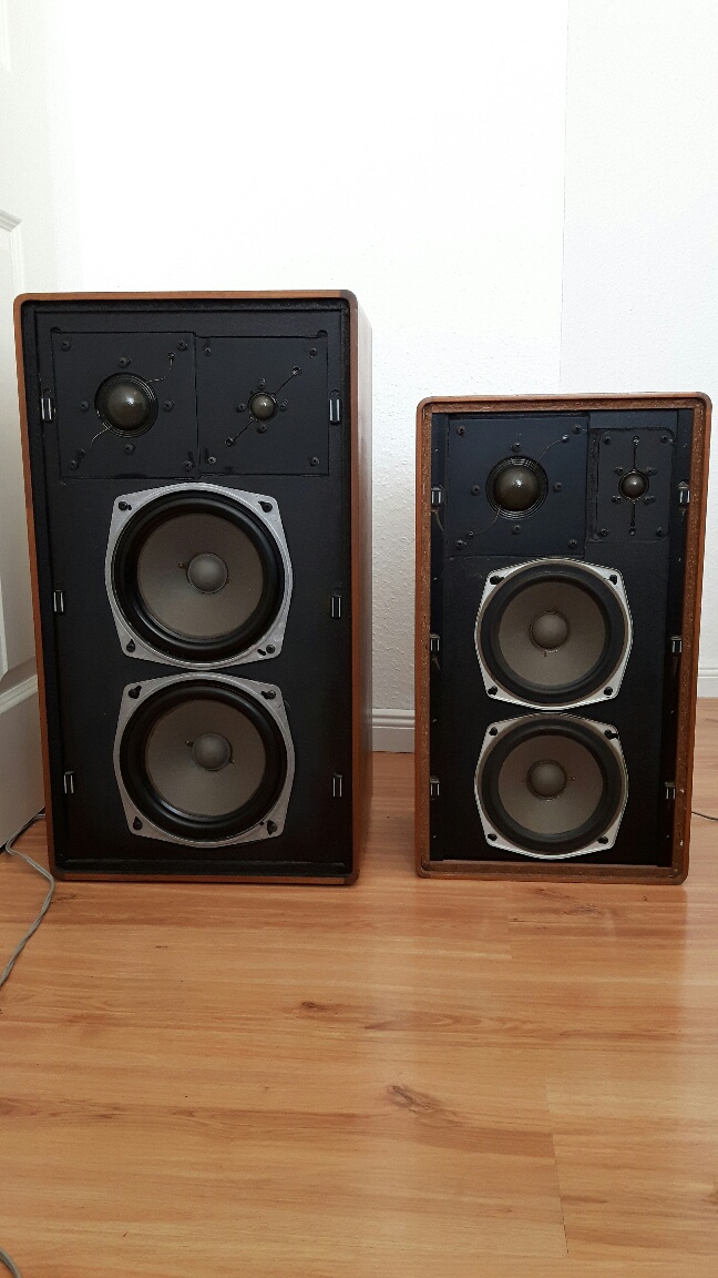 Nun war ich neugierig auf den großen Bruder, die L810 geworden. Ähliche Bestückung im Hoch-Mitteltonbereich, aber größeres Gehäusevolumen und zwei 16,5 cm (Sickendurchmesser) Tieftöner. Tatsächlich habe ich ein sehr gut erhaltenes Paar gefunden in nussbraun, fast keine Kratzer und sehr gut erhaltene Lochblechabdeckungen. Der Vergleichstest mit den L710 war dann jedoch ernüchternd. Hoch/Mitteltonbereich war in Ordnung und klang ähnlich (evtl. die Höhen etwas weniger klar), der Bassbereich war jedoch enttäuschend. Kein Volumen und bei weitem nicht so voll und tief wie bei der L710. An zwei Verstärkern und in verschiedenen Räumen der gleiche Effekt. Auch das Vertauschen der Pole der Anschlusskabel änderte nichts.