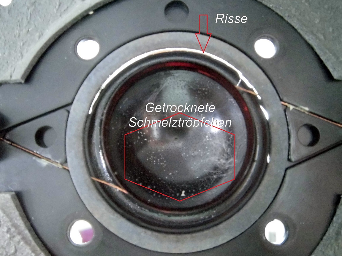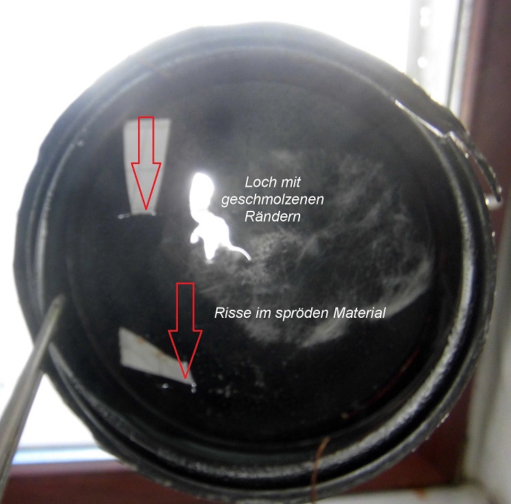 Der andere ist im Übergang Sicke / Kleberand gebrochen. Und wunderschön sind auf der Innenseite die getrockneten Tröpfchen der geschmolzenen verdampften Ausgasung zu sehen.