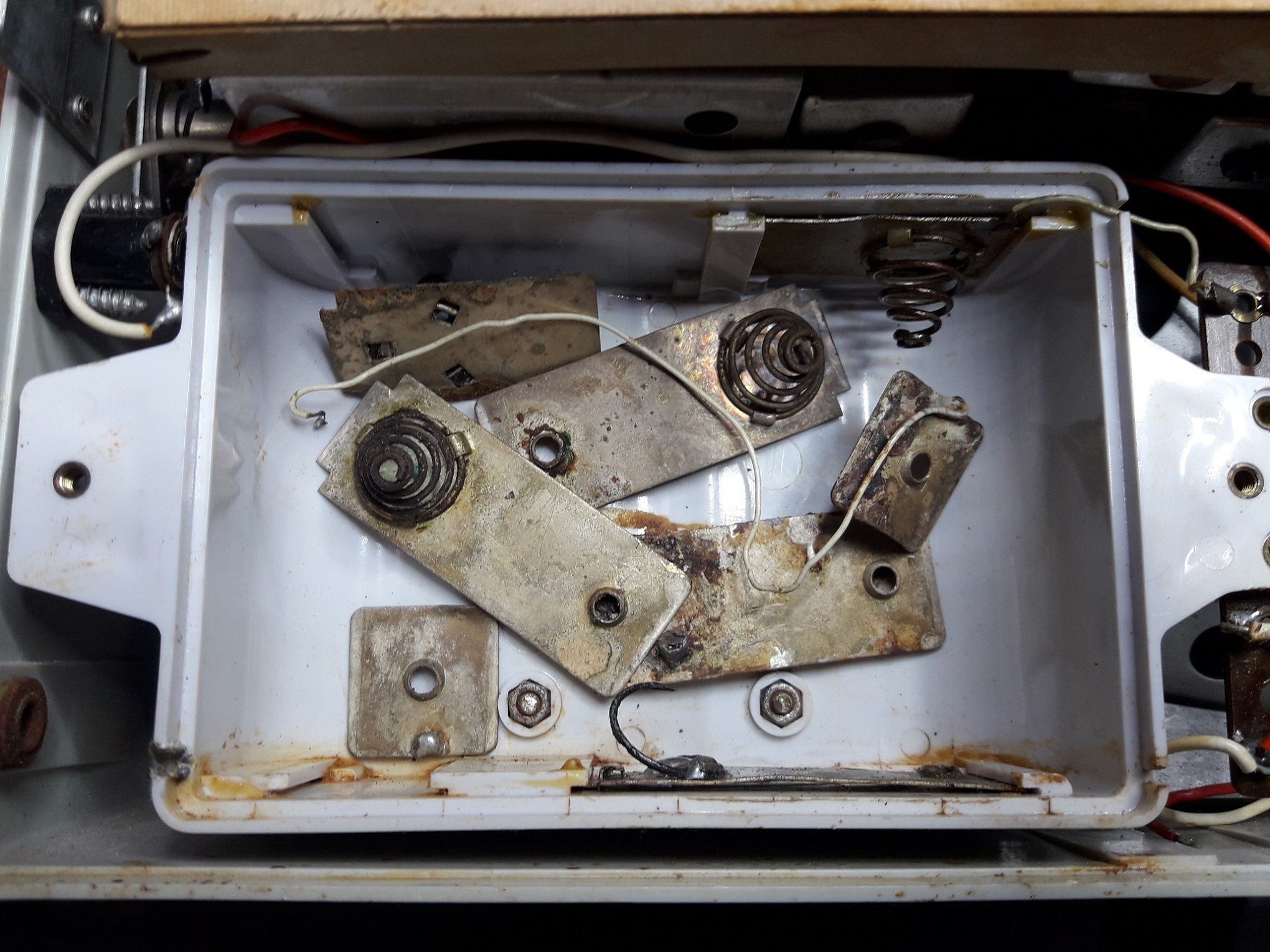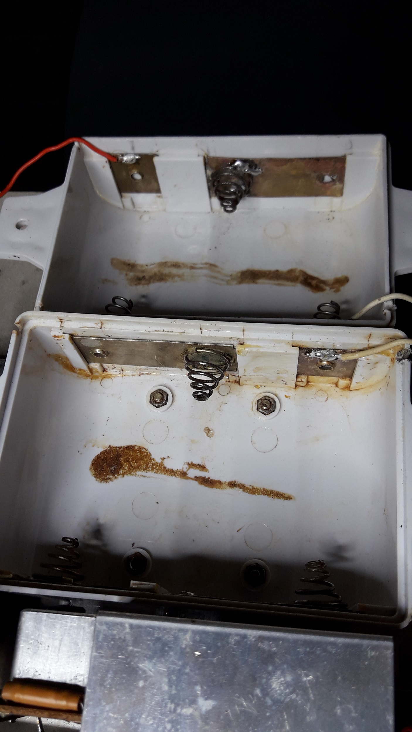 Die Kontaktbleche im Batteriekasten sind teilweise stark durch ausgelaufene Batterien korrodiert. Es fehlen auch zwei Federn.
