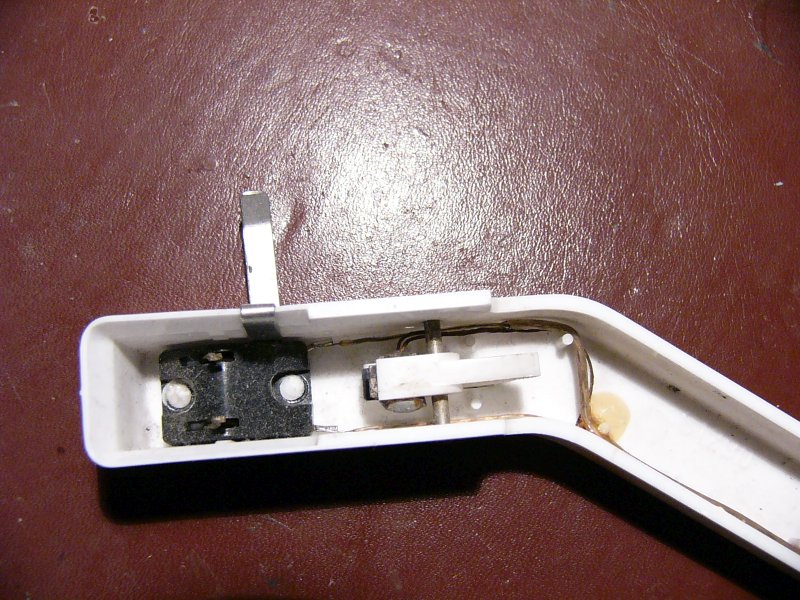 Ein Foto von einer intakten Tonarmaufnahme füge ich an. Der Tonabnehmer wird an den beiden Drahtbügeln vorne (sind gleichzeitig die Kontakte für rechts/links) eingehängt, leicht nach vorn geschoben und hinten in der Schaltwippe für die zwei Nadelpositionen eingehängt. Hinten ist gleichzeitig der Massekontakt.