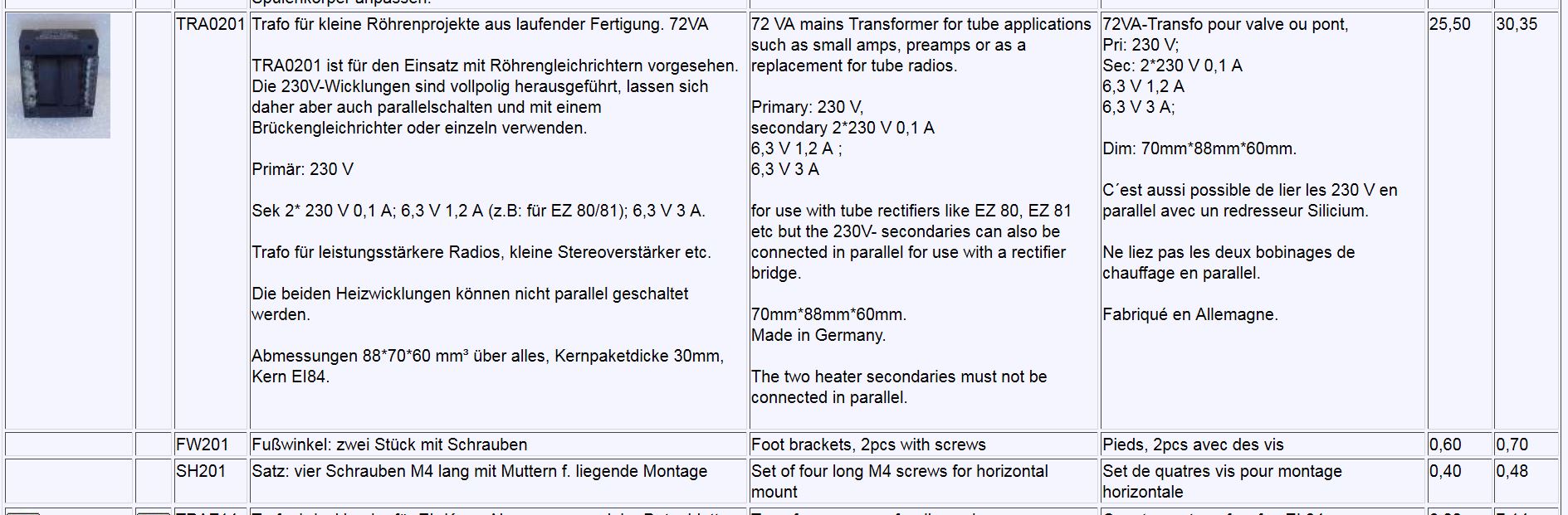 TRA0201: This is a more powerfull transformer on sec.1 (2*230V / 100mA - parallel wiring) which might be the better choice. The sec.2 heater output (6,3V / 3A) is a bit less powerfull compared to the TRA200 but still OK. If you want to be on the safe side, it is a rule of thumb to dimension the transformer output (current) by adding 50% plus as a reserve to withstand the peak amplification and stress on the long run.