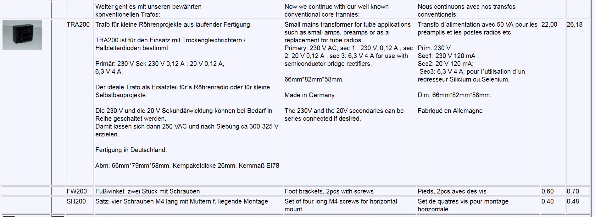 TRA0201: This is a more powerfull transformer on sec.1 (2*230V / 100mA - parallel wiring) which might be the better choice. The sec.2 heater output (6,3V / 3A) is a bit less powerfull compared to the TRA200 but still OK. If you want to be on the safe side, it is a rule of thumb to dimension the transformer output (current) by adding 50% plus as a reserve to withstand the peak amplification and stress on the long run.