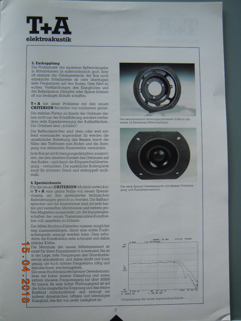 Die Beschreibung der T+A Lautsprecher, deren „Konstruktionsmerkmale“ und die „Auslegung aller Lautsprecher Chassis“ sind auf die beiden Fotos beschrieben.