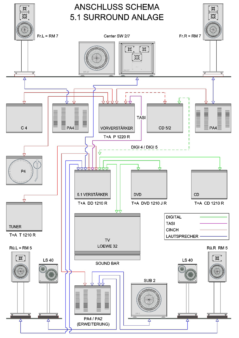 Das „Anschluss Schema 5.1 Surround Anlage“ zeigt hier die vielfältigen Möglichkeiten.