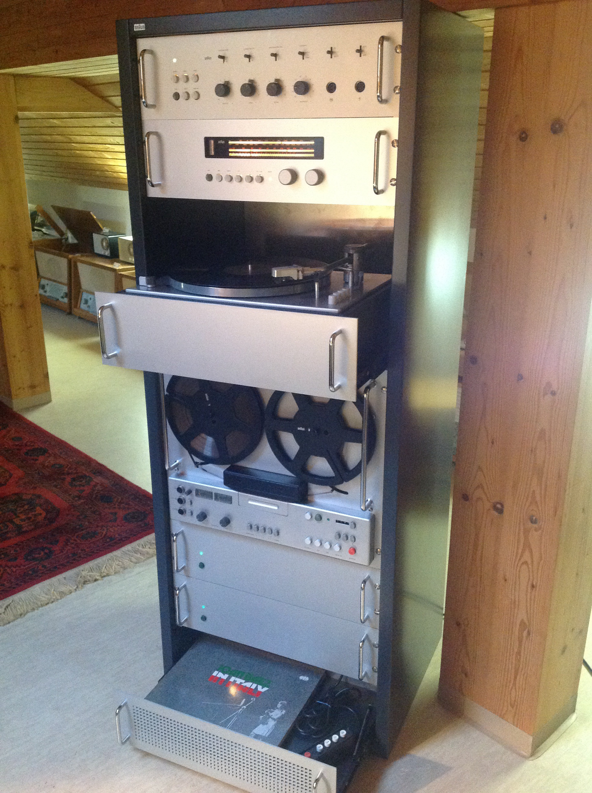 Zu Gunsten der besseren Bedienbarkeit habe ich die Position Plattenspieler und Tonband getauscht. Der Einschub läuft auf kugelgelagerten Schienen mit Selbsteinzug, in der Mitte der Bodenplatte ist ein 50er Loch, durch das die Kabel erst nach unten und sodann in der doppelten Alu- Rückwand nach oben zum CSV gehen. Die Rückwand habe ich im Bereich des Plattenspielers und ein wenig darunter doppelt in sandwich ausgeführt, damit man die Kabel nicht sieht, wenn der Schuber herausgezogen ist.