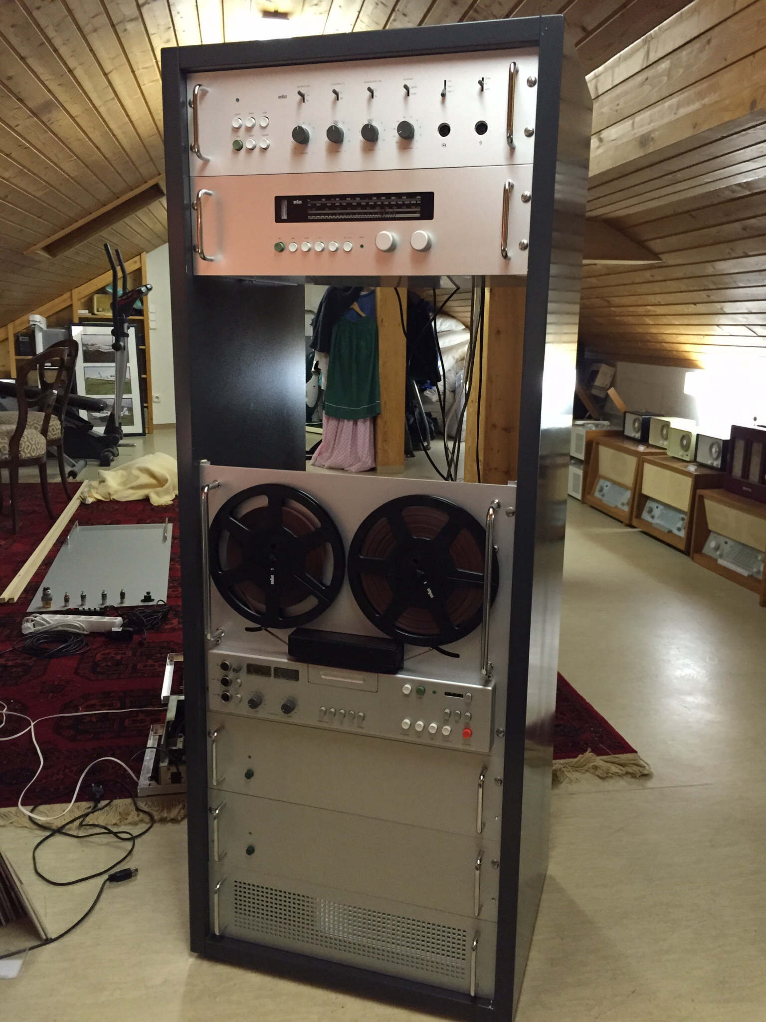 als ich vor einiger Zeit von Ede drei ELA Blenden für CSV 500, CE 500 und das TG 1000 bekam, war dies für mich der Anlass eine ELA Anlage zu bauen. Die Geräte und die TG 1000 Blende sind von BRAUN, der Rest sind Sonderanfertigungen, ich nenne sie deshalb "Pseudo-ELA" was aber der Freude keinen Abbruch tut. Die TG Blende dürfte sehr selten sein, da nach meiner Info die ELA Anlagen nur in geringer Zahl von 1967 bis 1970 gebaut wurden, das TG 1000 aber erst 1970 auf den Markt kam. Ich selbst kenne nur ein Originalfoto davon in einem Konzertsaal. Im einzelnen: