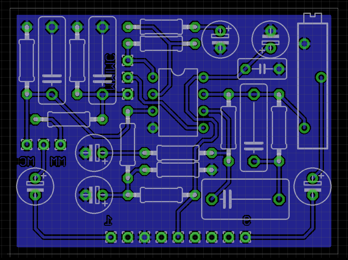 Der neue Phonopre kann sowohl MM als auch MC Systeme verstärken. Als kleines Gimmick lassen sich variable Abschlusswiderstände und -kapazitäten einlöten/einstecken. Die Umschaltung zwischen MM und MC erfolgt mit zwei Kurzschlusssteckern. Ein Poti für den Pegelabgleich ist auch vorgesehen. Die Platine ist so groß wie das Original und passt 1:1 in die vorhandenen Steckerleisten. Die Schaltung ist klassisch. NE5532 mit einer Beschaltung aus der Applikationsschrift. Für große high-endige Kondensatoren war sowieso kein Platz. Die Schaltung erfüllt ihren Zweck und für weitergehende Tuning-Maßnahmen läßt sich der Op-Amp sockeln ... Außerdem läßt sich der zweite Reserve Eingang auch bestücken und man kann dann zwei Plattenspieler direkt anschließen.
