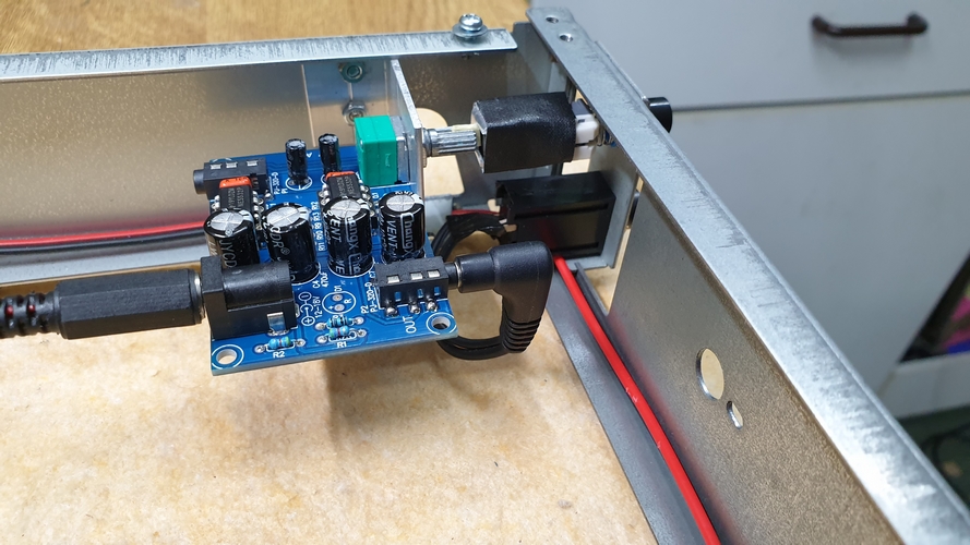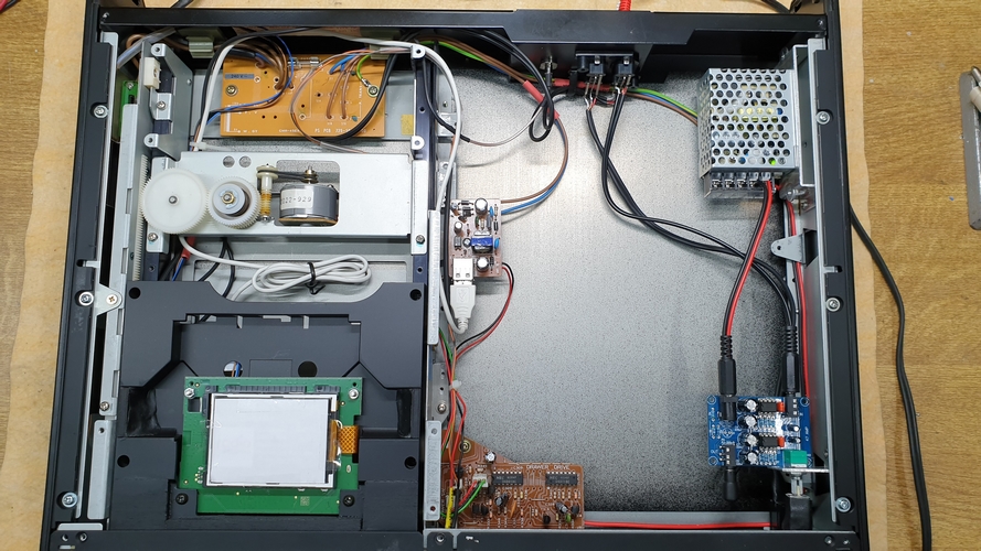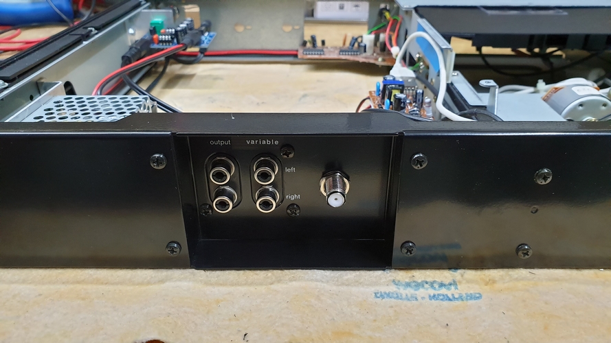 Das Entkernen des Cassettendecks ging relativ schnell. Außer der Steuerung des Sliders, die ich aus der Hauptplatine herausgesägt habe, blieb von dem Innenleben nichts übrig. Dann brauchte ich noch zwei Spannungsversorgungen: 15 V für den Slider und 5 V für den Adapter. Glücklicherweise brauchte ich den Kassettenschacht nur wenig verändern und der Adapter mit dem Display konnte mit vier Schrauben und ein paar Distanzstücken befestigt werden. Damit die Front nicht ganz so leer aussieht, habe ich die Ausschnitte für die ehemaligen Mikrofone belassen und in eine Kopfhörerbuchse mit darüber angeordnetem Pegelsteller umgebaut. Der Pegelsteller lässt sich sogar wie bei vielen anderen Ateliergeräten versenken. Für den Kopfhörer habe ich einen entsprechenden Verstärker eingebaut, der gleichzeitig einen regelbaren Cinchausgang versorgt. Damit haben die vier Cinchbuchsen auf der Rückseite auch eine sinnvolle Bedeutung (fix und variabel). Über dem Knopf für den Slider habe ich noch eine LED angebracht, damit man überhaupt sieht, ob das Gerät eingeschaltet ist. Der Ausschnitt für die ehemalige Kopfhörerbuchse beinhaltet nun den notwendigen IR-Sensor.