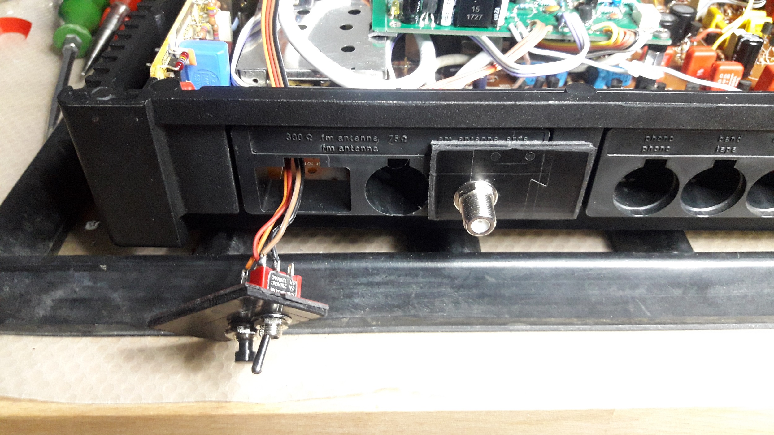 Die beiden Antennenbuchsen 300 Ω-FM und AM-Antenne werden ausgelötet, damit die Kabel für die Schalter und DAB-Antennenbuchse nach hinten