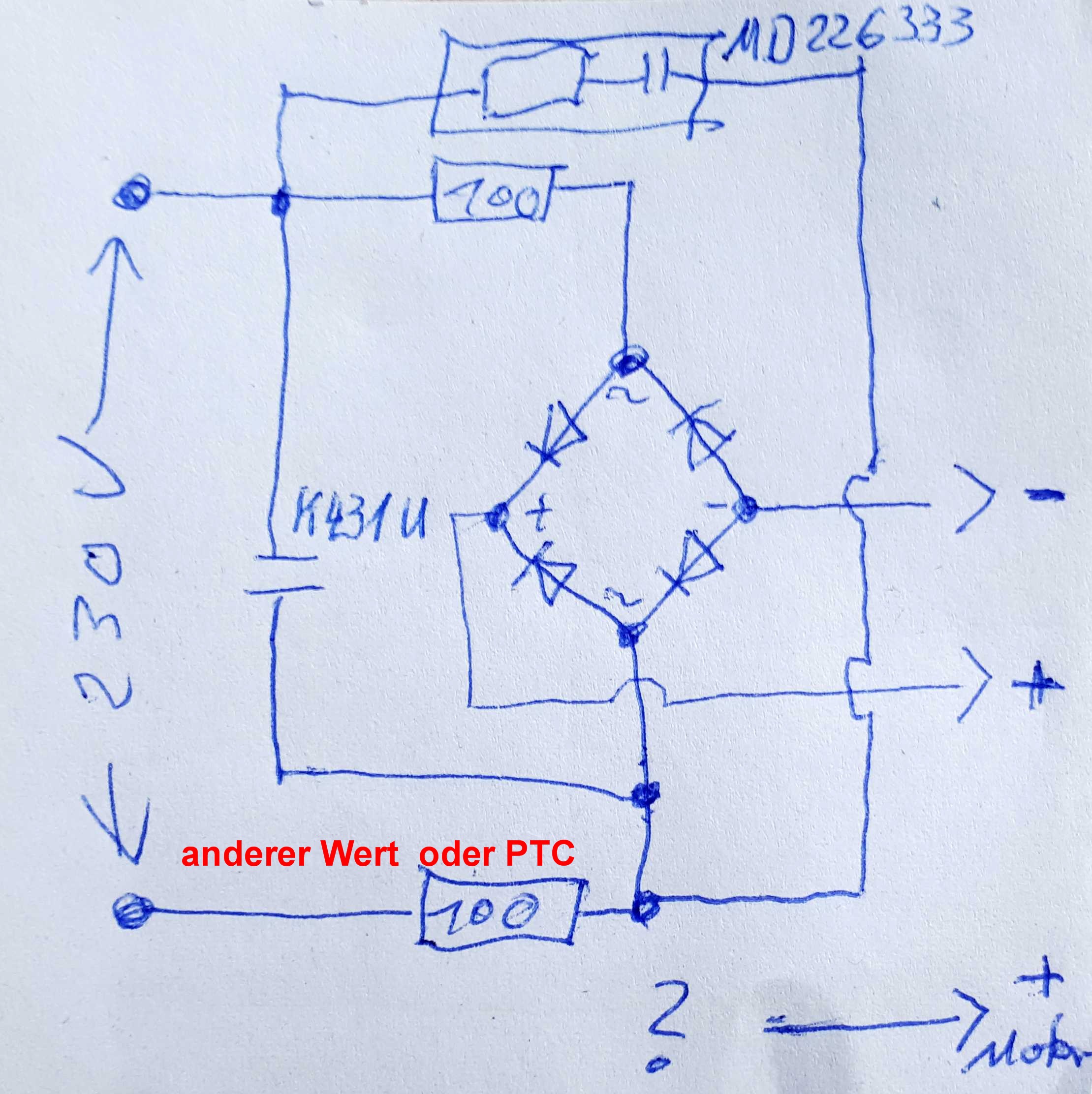 • der 100 Ω in der Plusleitung nach dem Gleichrichter