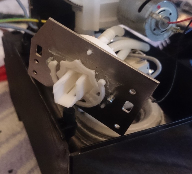 Zerlegen des Drehventils. Unter der Metallplatte befindet sich das Gehäuse mit den 2 Keramikscheiben. Die gebrochene Achse ist gut zu erkennen.