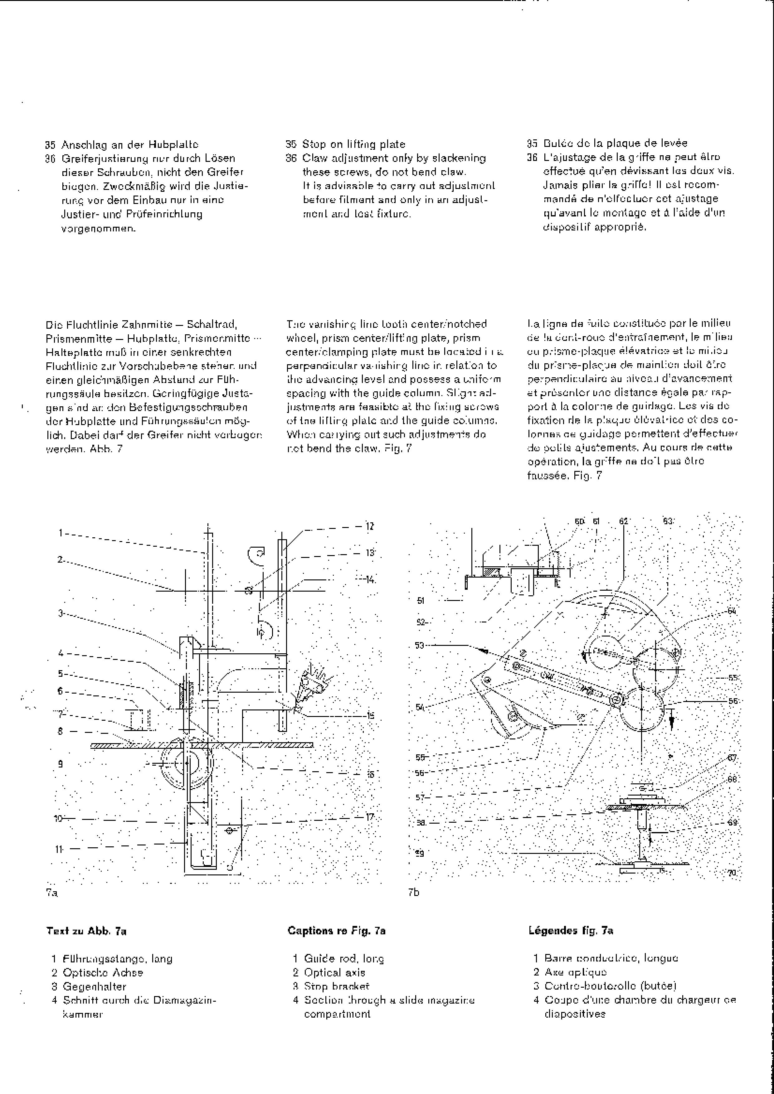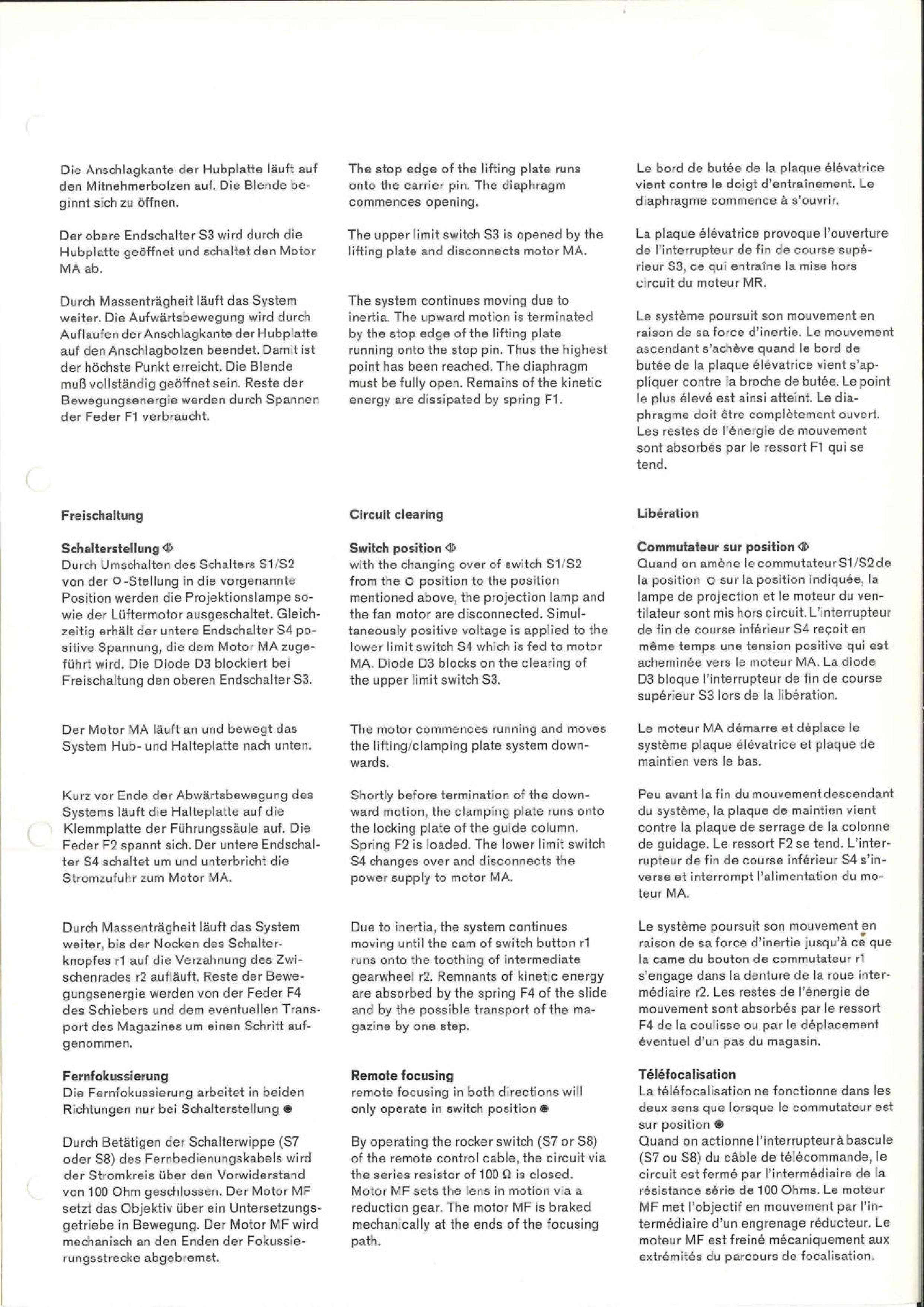 Dank der Beschreibung von Arthur kann ich nun die Teile auch richtig benennen. In Abb. 3 ist der Schaltknopf r1 bei mir auf ca. 3 Uhr gestanden (auch nach etlichen "Trocken-Durchläufen", also immer knapp/2-3 mm oberhalb von den Zacken des Zwischenrades r2). Nach längerer Beobachtung meinte ich, dass dies aber falsch ist, da dies ja für den Kassettenvor- und Nachschub wichtig wäre, dass es normal auf ca. 10 Uhr steht, damit sowohl beim Vor- als auch Rückschub der zeitliche Abstand zum Bewegen der Hub-und Halteplatte gleich sein soll. Nun habe ich dann den Schaltknopf so weit es ging abgezogen (ging nur ca. 5 mm) und den Zeiger des Knopfes auf die besagten 10 Uhr gestellt und wieder zurückgedrückt. Nun ging es zumindest nach vorne 3 Dia`s lang gut, aber beim Rückwärtsversuch hat es sich wieder so verklemmt, dass ich es auf die Schnelle noch nicht frei bekommen habe. Nun würde ich die Tage da wieder weiter machen. Gibt es da vielleicht einen Trick für die Feinjustierung? Und wie bekomme ich die Kassette wieder am einfachsten raus?