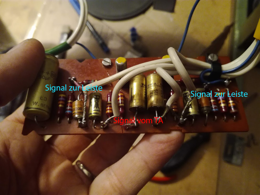 Ein weiteres Problem habe ich mit den Anschlüssen. Mir wird nicht ersichtlich, wo die Spannungsversorgung angelegt ist und wo der Ton abgenommen wird. Der auf dem Bild gezeigte Stecker passt zwar in die Buchsenleiste, er führt das weiße Spannungskabel zum Motor. Die Buchsenleiste nimmt die Signale (r+l+Masse) vom VV auf, müsste aber auch an 115 Volt für den Motor hängen. Würde ich nun ich den Stecker in die Leiste stecken und lege dort Spannung an, bekämen Motor und die VV über Blau 115 Volt Spannung, Demnach wird die VV mit dem Signal vor den Elkos versorgt und auf der Gegenseite mit 115 Volt gespeist. Ich bezeifele, dass das richtig ist!? Wo nehme ich das Signal dann ab und wo wird die Spannungsversorgung angelegt?
