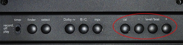 Dabei wird im linken Kanal ein 400 Hz Ton und im rechten ein 10 KHz Ton eingespeist, deren Pegel auf den LED Austeuerungsanzeigen dargestellt wird. Durch die Hinterbandabtastung läßt sich die Einstellung getrennt für Level/Bais auf 0 (dB) justieren. Die Betätigung der Rücklauftaste beendet den Einmeßvorgang speichert den Meßwert.