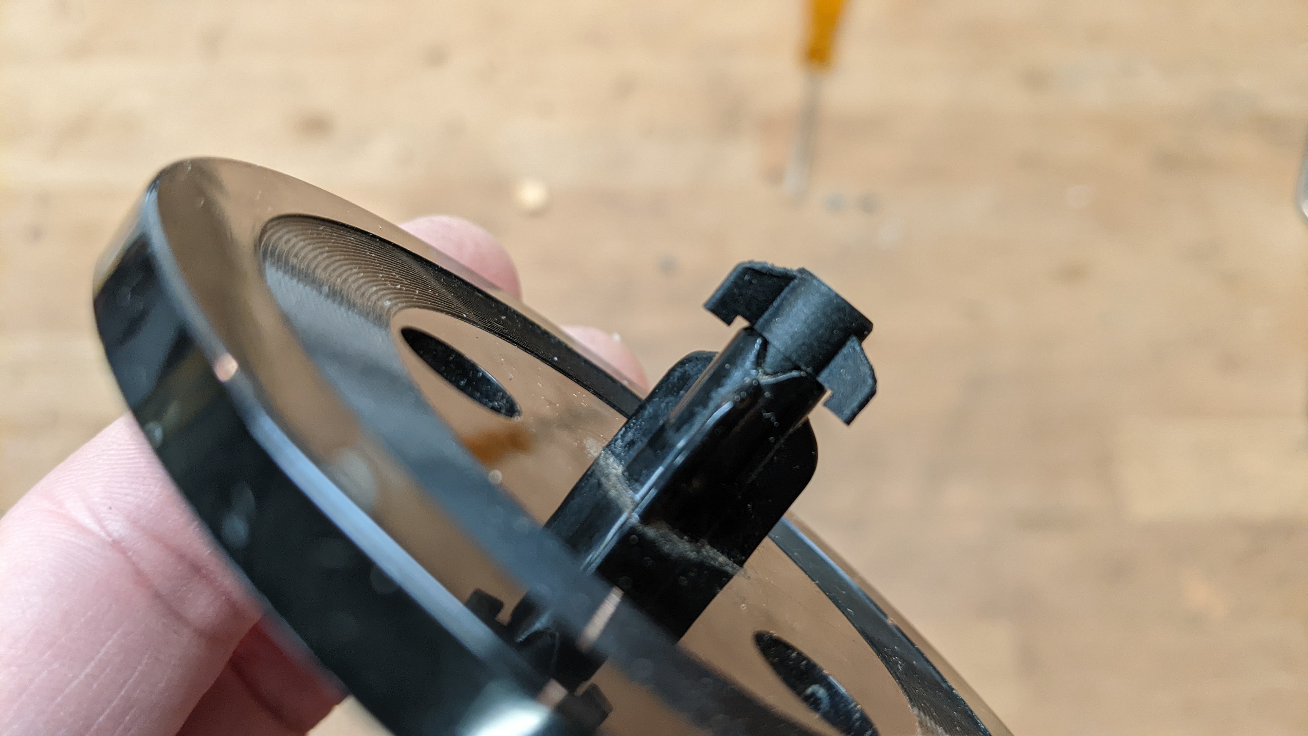 - Ist der alte Dreizack entfernt, kann man mit der Welle die braune Kappe auf der Rückseite des Wickeltellers rausdrücken. (Vorsicht, die Welle steht unter Federdruck und kann nach hintern rausschießen)
