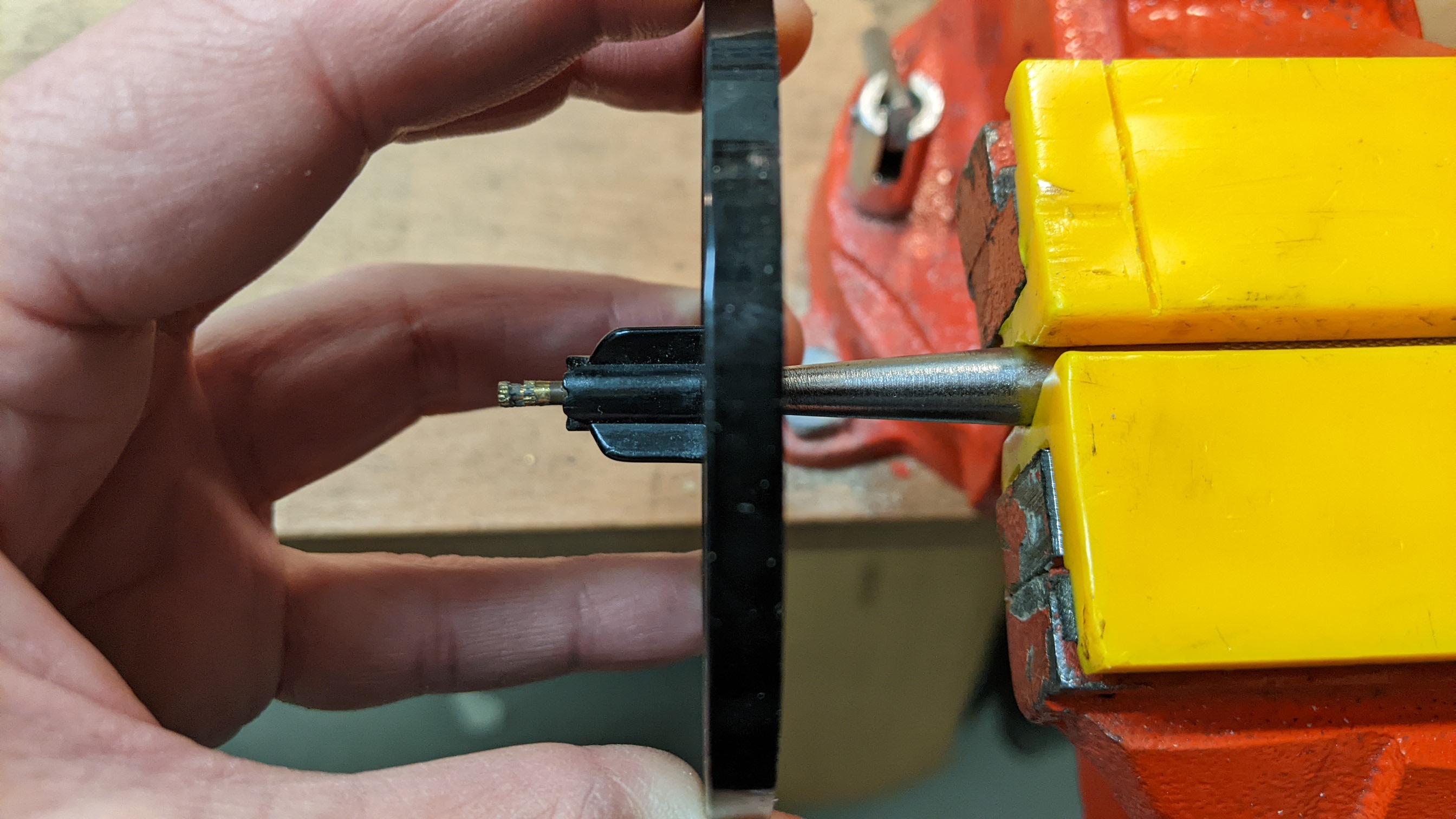 - Einen Körner oder Kreuzschraubendreher als Gegenhalter von hinten auf das Zentrum der Welle drücken.
