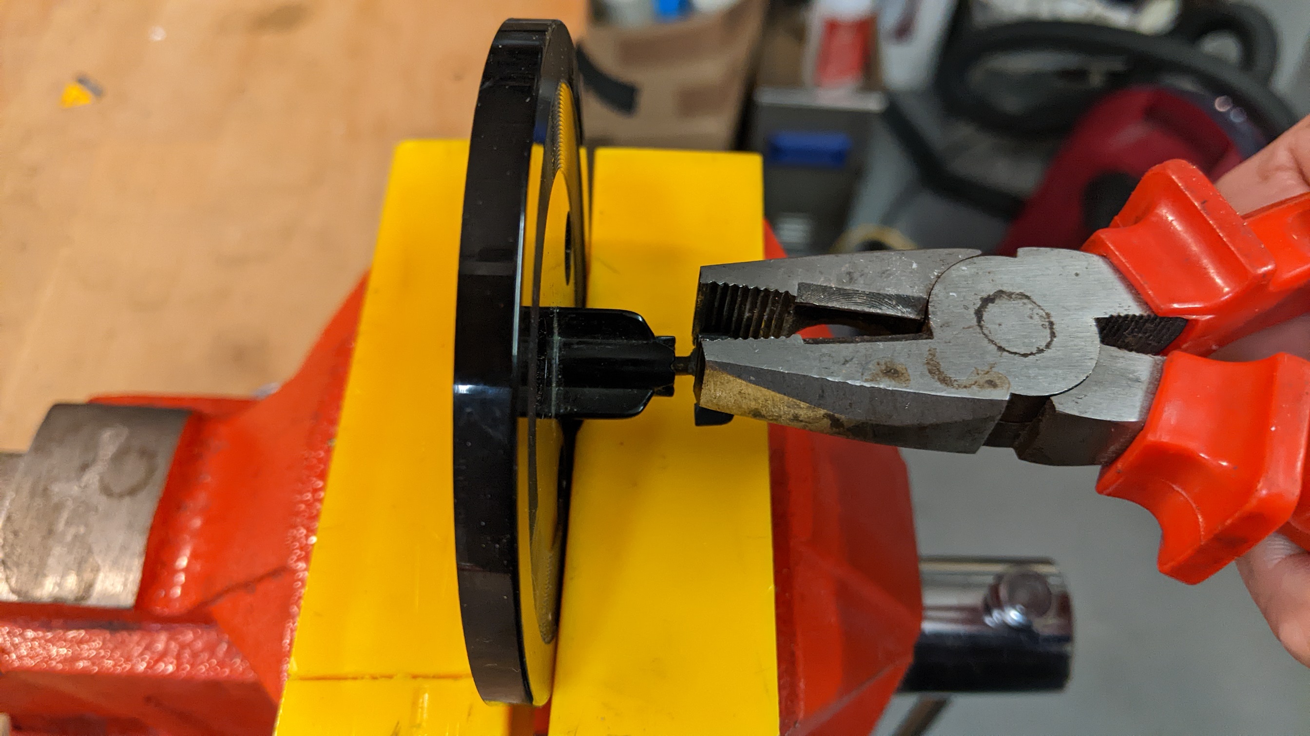 - Den alten Dreizack mit einem Seitenschneider, Puksäge oder Kombizange aufsprengen und von der Welle des Wickelteller restlos entfernen. (Dabei darauf achten die Welle nicht zu beschädigen)