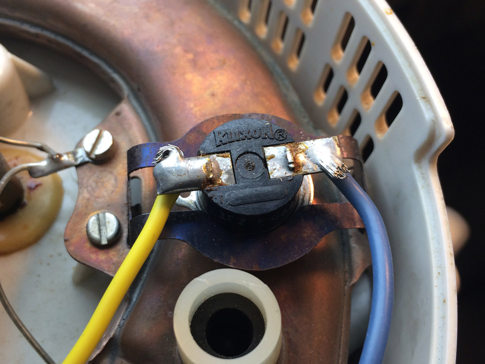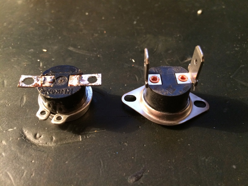 Hier ein Foto vom Zustand direkt nach dem Aufschrauben (also erst schwarzer Metalldeckel, darauf Heizung, darauf rundes (Kupfer?-) Zwischenstück, zuletzt Aluplatte. Ist das richtig so? Ich hätte getippt, dass das runde weiße Keramik auf den Fußboden gehört und erst darauf dann die Heizplatte. Desweiteren schrieb carlos in einem Beitrag von 2012, dass die Thermoschalter gerne mal kaputtgehen. Ich habe nun den oberen Gehäuseteil abgenommen und den Thermoschalter auf Durchgang geprüft. Ergebnis: Durchgang. Verstehe ich das richtig, dass sich diese Schalter erst ab einer bestimmten Temperatur schließen und dann wieder öffnen, sobald eine bestimmte Temperatur überschritten wurde? Wenn ja, ist mein Thermoschalter wohl defekt. Ich habe mich nach Ersatz umgesehen, es handelt sich um einen Typ von KLIXON. Hat irgendjemand vielleicht die genauen Werte? Es gibt ja zig verschiedene Varianten. Hier ein Bild: Vielen Dank im Voraus schon mal.