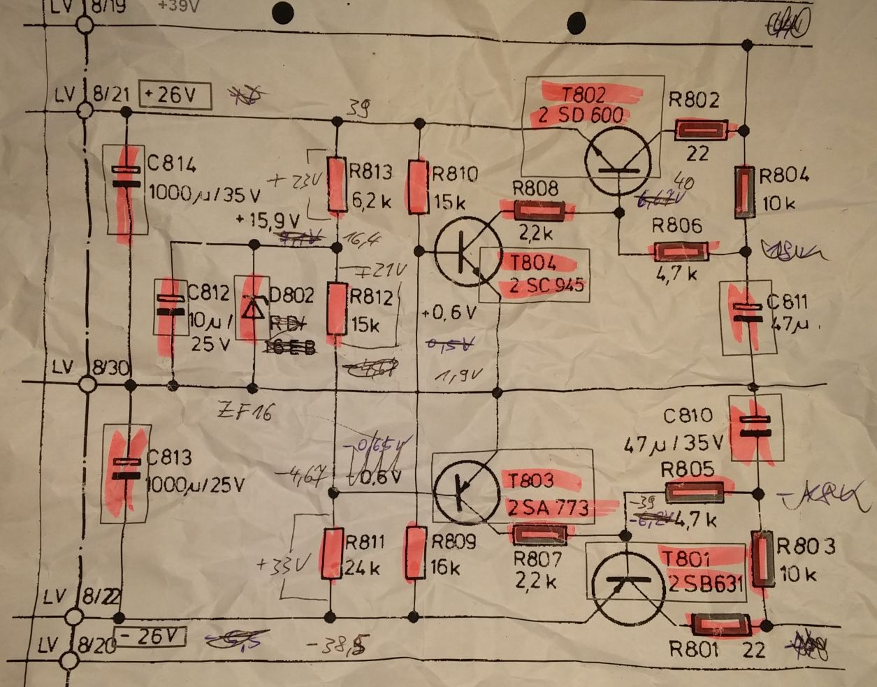 ich kenne den A2 leider überhaupt nicht, aber ist die mittlere Leitung Masse (LV8/30)? Wenn ja, würde 1.9V an der Basis von T804 bedeuten der Transistor ist kaputt oder der falsche Typ. Ein NPN Transistor hat typischerweise ein Flussspannung von 0.7V. Ganz blöde Vermutung: T803 und T804 ausversehen vertauscht? Was für Ersatztypen hast du da eingebaut? Ansonsten würde ich mich erstmal auf die untere Hälfte (negative Spannung) konzentrieren, da die wohl die Referenz für die positive ist.