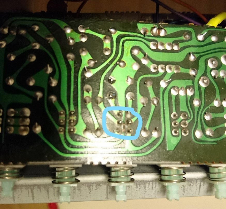 Und dann hab ich mir mal die Verbindung von Main in und Filter-Platine angeschaut. Die war auch intakt, aber von Filterplatine zum Vorverstärker gab es keine Verbindung. Und in Blick mit der Lupe auf die Platine hat dann auch die Ursache zum Vorschein gebracht.