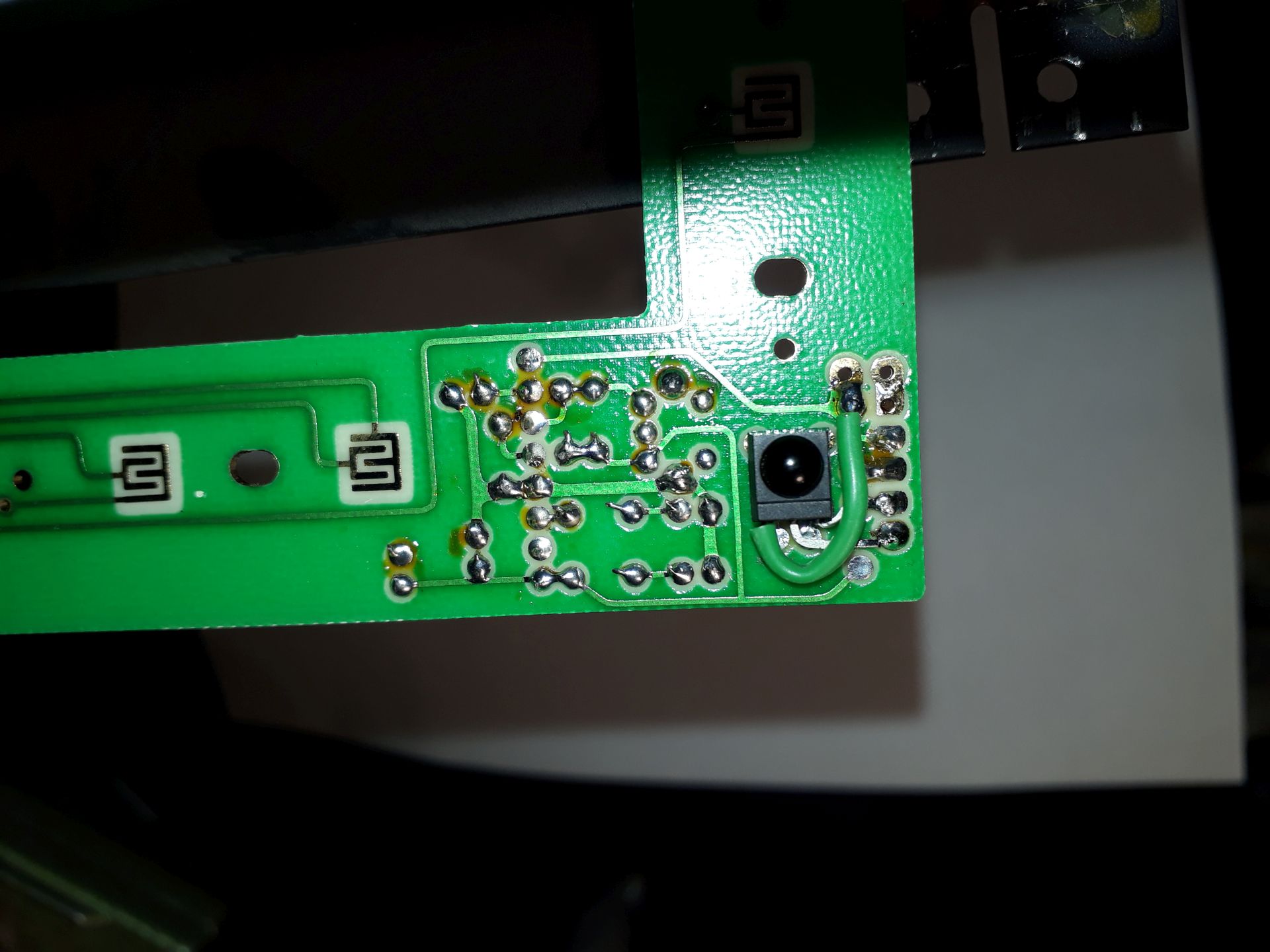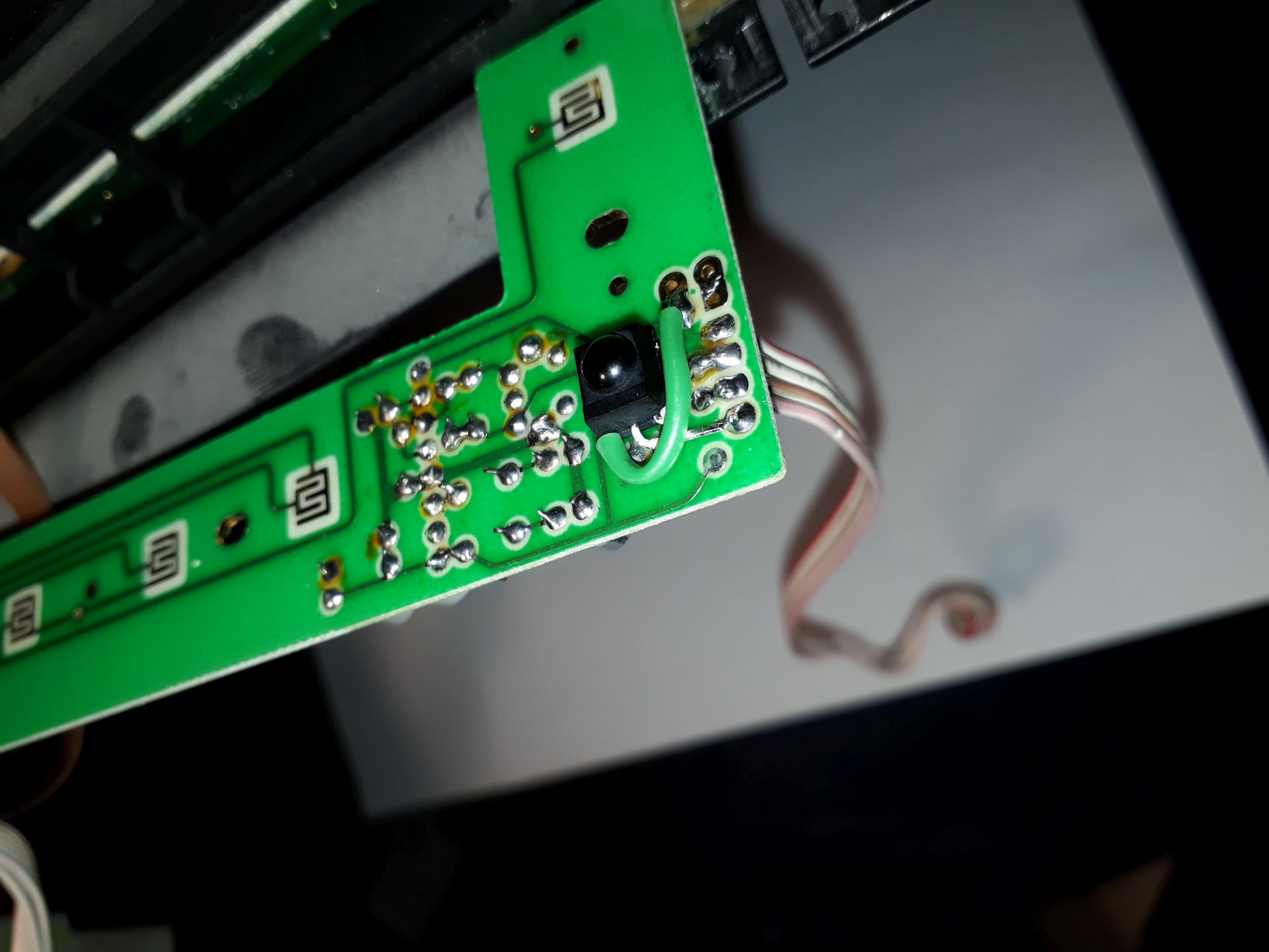 Mir war allerdings aufgefallen, dass der dort gezeigte Schaltplan in Gunnars Anleitung fehlerhaft ist - bzw. genauer: er ist nicht konsistent zu den Fotos und dem tatsächlichen Aufbau. Wer den Sensor so einlötet wie auf dem Foto (unter Punkt 4 der Anleitung), darf die 5V und Masse-Leitungen nicht so an die Platine anlöten, wie im Schaltplan unter Punkt 3.2 gezeigt - ansonsten wird der TSOP4833 genau falsch angeschlossen (5V und Masse vertauscht).