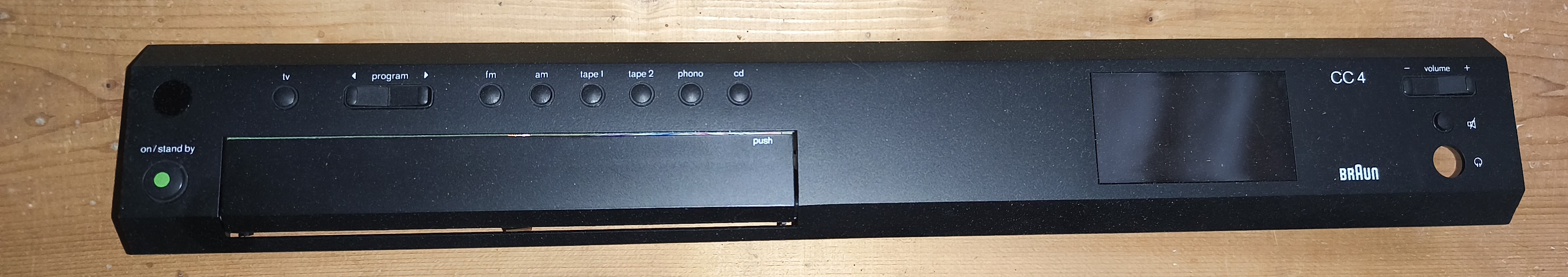 ich habe noch eine komplette neue schwarze CC4/2 Front inklusive Toblerone, Tasten, Tastenwippen und Power-Taste: Auch die Platinen dahinter sowie die Tobleronemechanik ist mit drin: Sie stammt noch aus der Auflösung von Herrn Henrikie, ein ehemaliger Braunmitarbeiter aus dem Service.