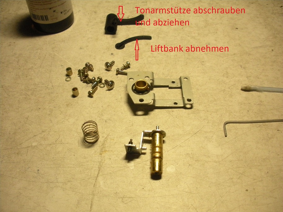 Glaub so einfach mit Öl reinkippen und Achse rausnehmen ist das nicht. Erstens ist das kein Öl sondern eher eine Mischung aus Honig und Baumharz. Zweitens hängt an der Achse 65 noch der Blechwinkel dran, der den Readschalter betätigt. Aber Liftbank 61 vorsichtig raushebeln, dann Schraube 63 aus dem Gewinde lösen und danach Tonarmstütze 62 abziehen ist schon mal ein Anfang. Die Schraube muss nicht ganz raus, nur aus dem Gewinde der Achse. Tonarmstütze leicht hoch damit man sie etwas drehen kann, dann kommt man am Tonarm vorbei. Vosichtshalber Tonabnehmer vorher raus. Danach umdrehen und unten alles abschrauben ( Bodenplatte, Fuß, ...) wie in der Anleitung Seite 5 "Ausbau des Tonarmantriebs"