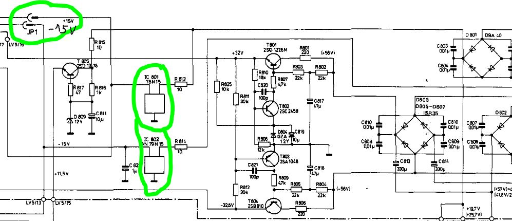 Moin, die Spannungsregler 7815 & 7915 in der Versorgung.