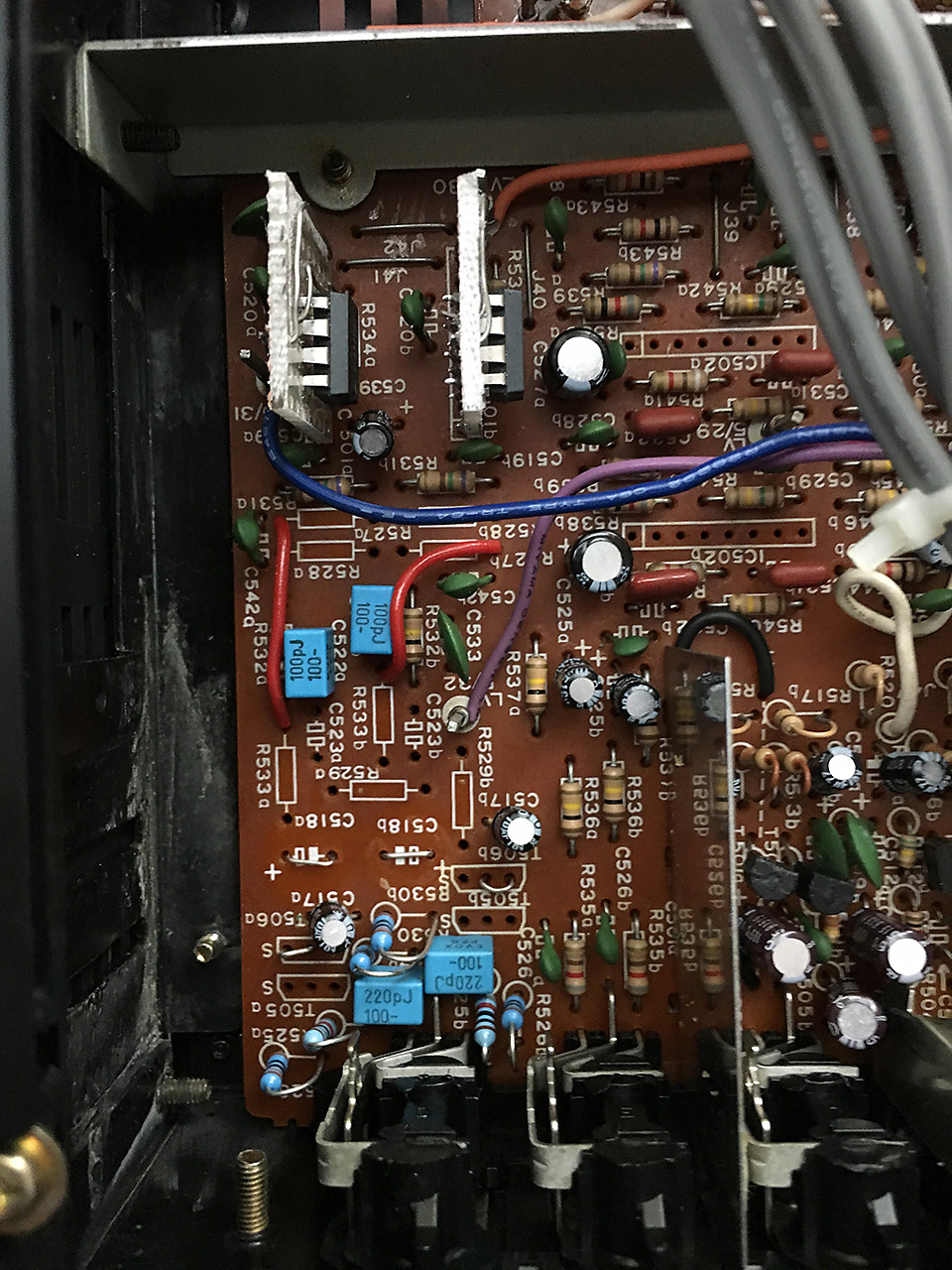 Ich habe dann die Kabel abgelötet, zwei neue Widerstände bestückt und den Verstärker eingschaltet. Jetzt waren an den Lötpunkten die korrekten Versorgungsspannungen zu messen. Der Spannungsregler ging also noch, der Fehler musste "nach" den Kabeln zu finden sein. Da bleibt nicht viel, diese Versorgungsspannung wird nur benutzt, um die vier IC µPC1207 zu versorgen.
