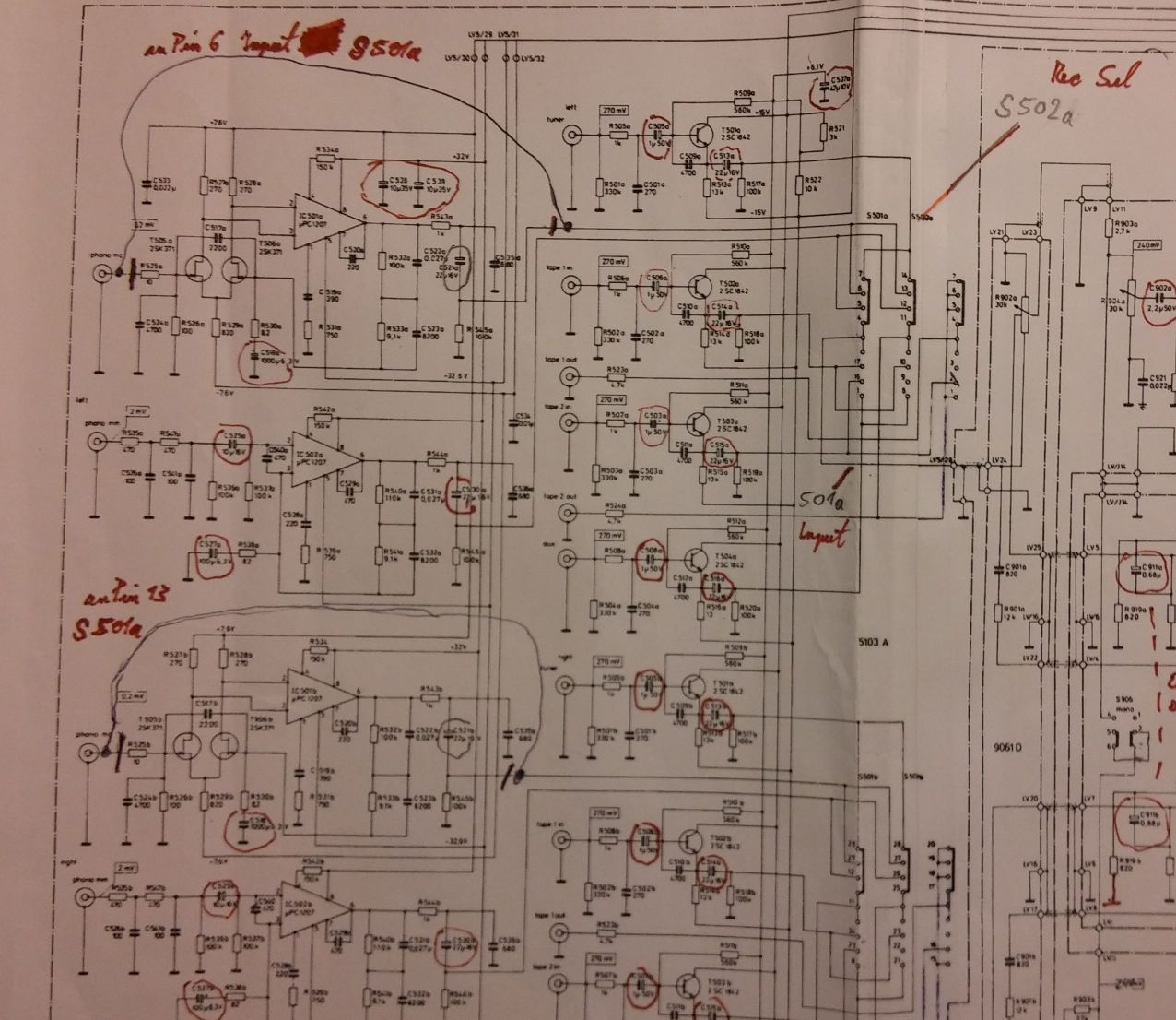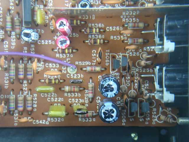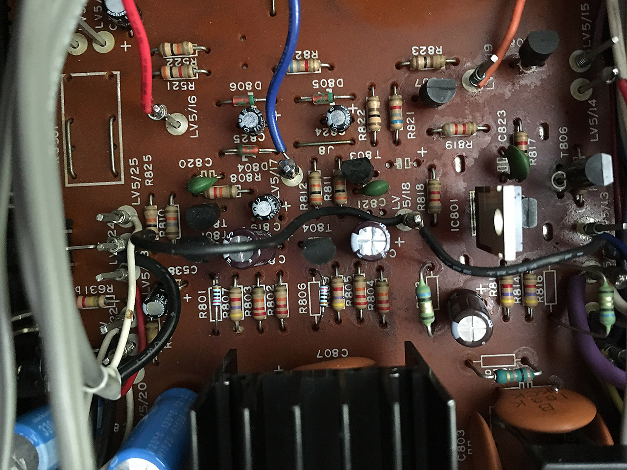 Ich hatte den Umbau nämlich komplett fertig, allerdings funktionierte nichts, Signale an diesem Eingang blieben stumm. Ganz schnell fand ich heraus, dass die Versorgungsspannung fehlte, was aber auch kein Wunder war. Irgendjemand hatte die Widerstände R801 und R806 ausgelötet. Ebenso waren die Kabel an LV5/16 und LV15/17 gelötet, es hatte jemand offensichtlich einen Fehler gesucht.
