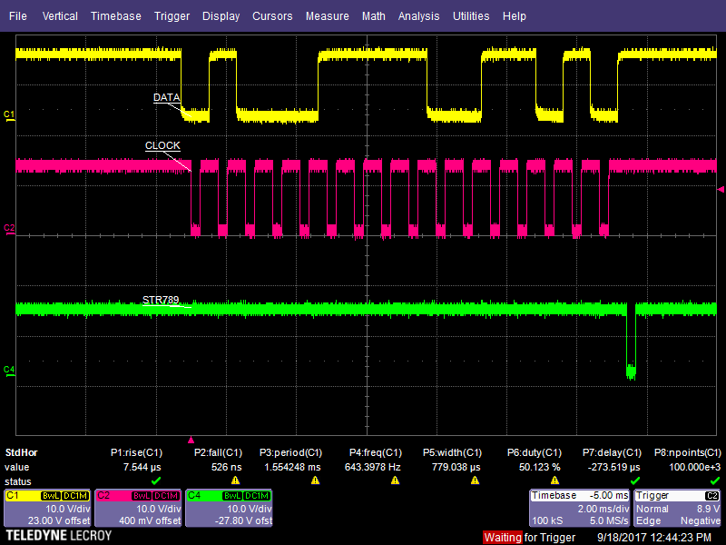Im Anhang ein Bild der Datenübertragung. Die Daten werden bei Low Pegel am Clock Signal durch das Schieberegister geschoben, bei Low Pegel auf Strobe übernommen.