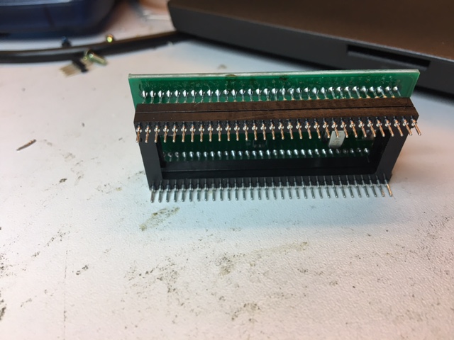 Die Software schreiben dürfte wohl der größte Aufwand werden. Anbei noch ein paar Fotos des aktuellen Standes. Ich habe jetzt zwei 64 Pin Sockel genommen, um die Platine in den original Prozessorsockel stecken zu können. Ich vermute aber, das ganze wird dann zu hoch, und dann bekomm ich den Deckel vom Gehäuse nicht mehr drauf. Es gibt dafuer eigentlich spezielle Verbinder, aber da habe ich keine gefunden - Die Bauform ist mittlerweile einfach zu selten. Egal, genug der Details.