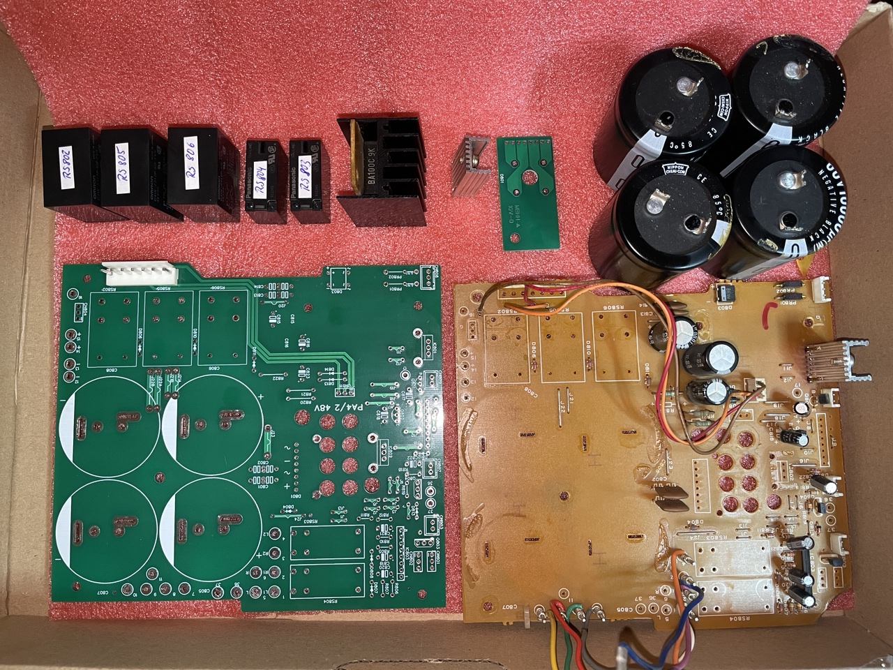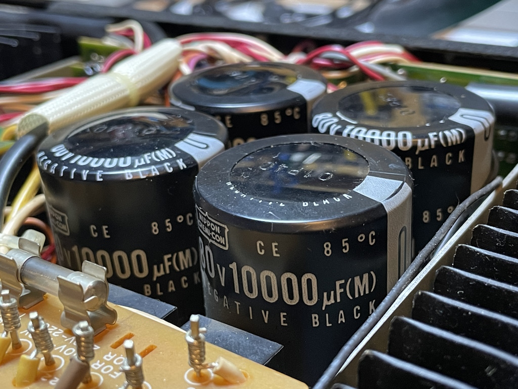 Nach dem Öffnen der oberen Abdeckung, sah ich dann auch die starke Ausbeulung zwei der vier Siebelkos. Mit dem Finger leicht auf die Erhebung gedrückt, konnte man den Druck regelrecht spüren, der sich nach kurzer Betriebszeit im inneren der Elkos aufbaute.