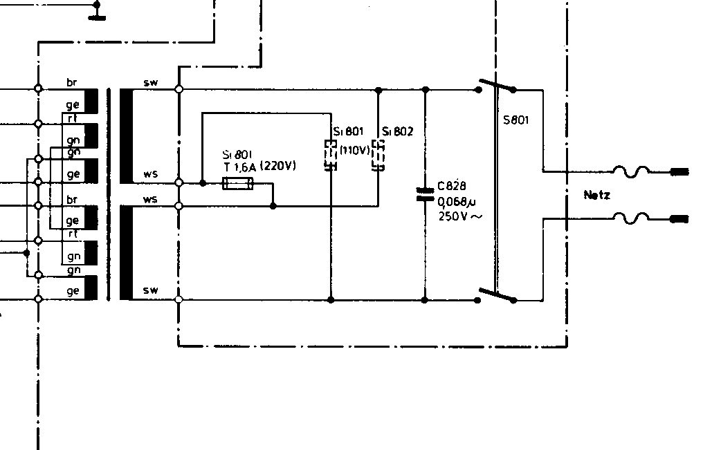 Bei der Suche ist mir aufgefallen, dass im Schaltplan im Gegensatz zum Platinenlayout bei 220V nur 1 Sicherung Si801 vorgesehen ist, die 110V sind natürlich fehlend. Außerdem fiel mit eine "dünne" Verbindung wie ein Lötstreifen oder -faden auf der Platine auf, der die Si801 umgeht. Dachte zunächst an Fehler, fand auf Fotos hier im Forum ähnliches, vielleicht von Braun so gemacht, die Si801 wäre dann eine Reserve, falls Si802 durchbrennt.