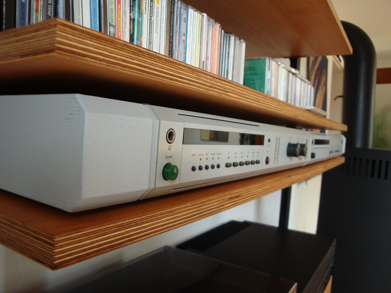 anlässlich meines Umzugs im April dieses Jahres habe ich endlich vom Schreiner meines Vertrauens die zur Breite und Tiefe der studioline-Geräte passenden Holzelemente für mein Spannstützenregal anfertigen lassen. Das Material ist Birke Multiplex 18 mm, Deckfurnier Buche (A/B-Qualität), Oberfläche geölt.