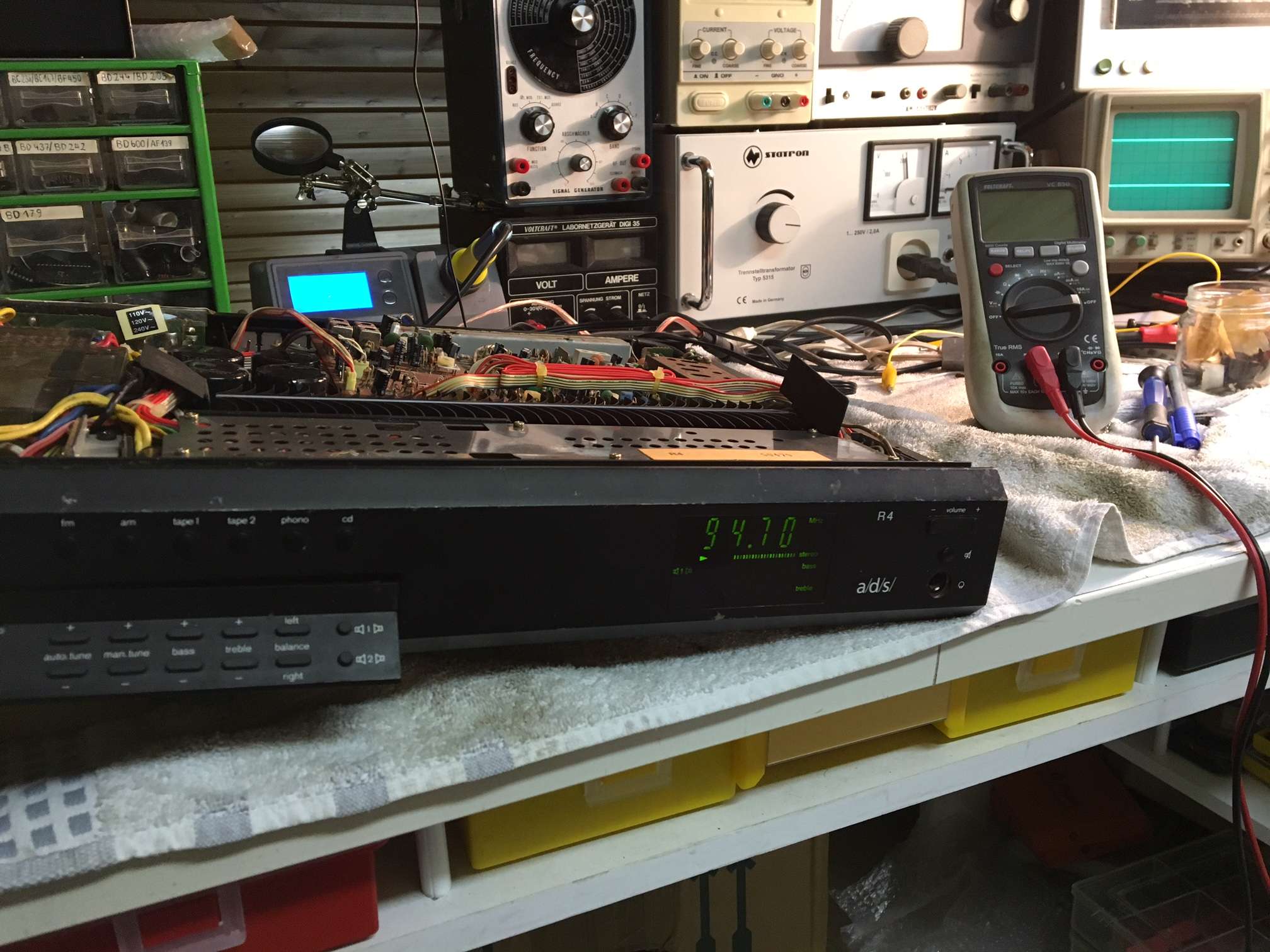 Als ich pre und main amp brückte, hörte ich auf beiden Kanälen ein lautes "plopp plopp plopp" im Sekundentakt. Dieses Signal lag auch beim Tunerausgang an, also dachte ich, muss was mit der Spannung sein.