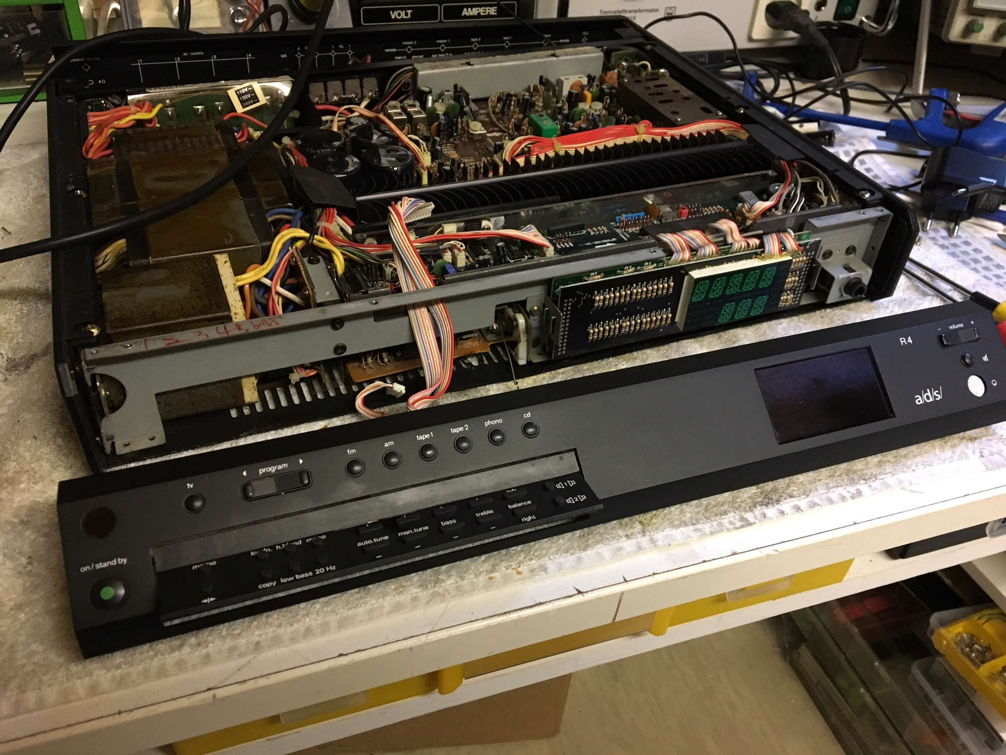 Als dann beim ersten Test bei 120V das Display was lesbares anzeigte und der main amp auf beiden Kanälen ging, packte mich der Ehrgeiz, wobei ich sagen muss, dass ich reiner Autodidakt, Hobbybastler bin und daher alles ein bisserl länger dauert...
