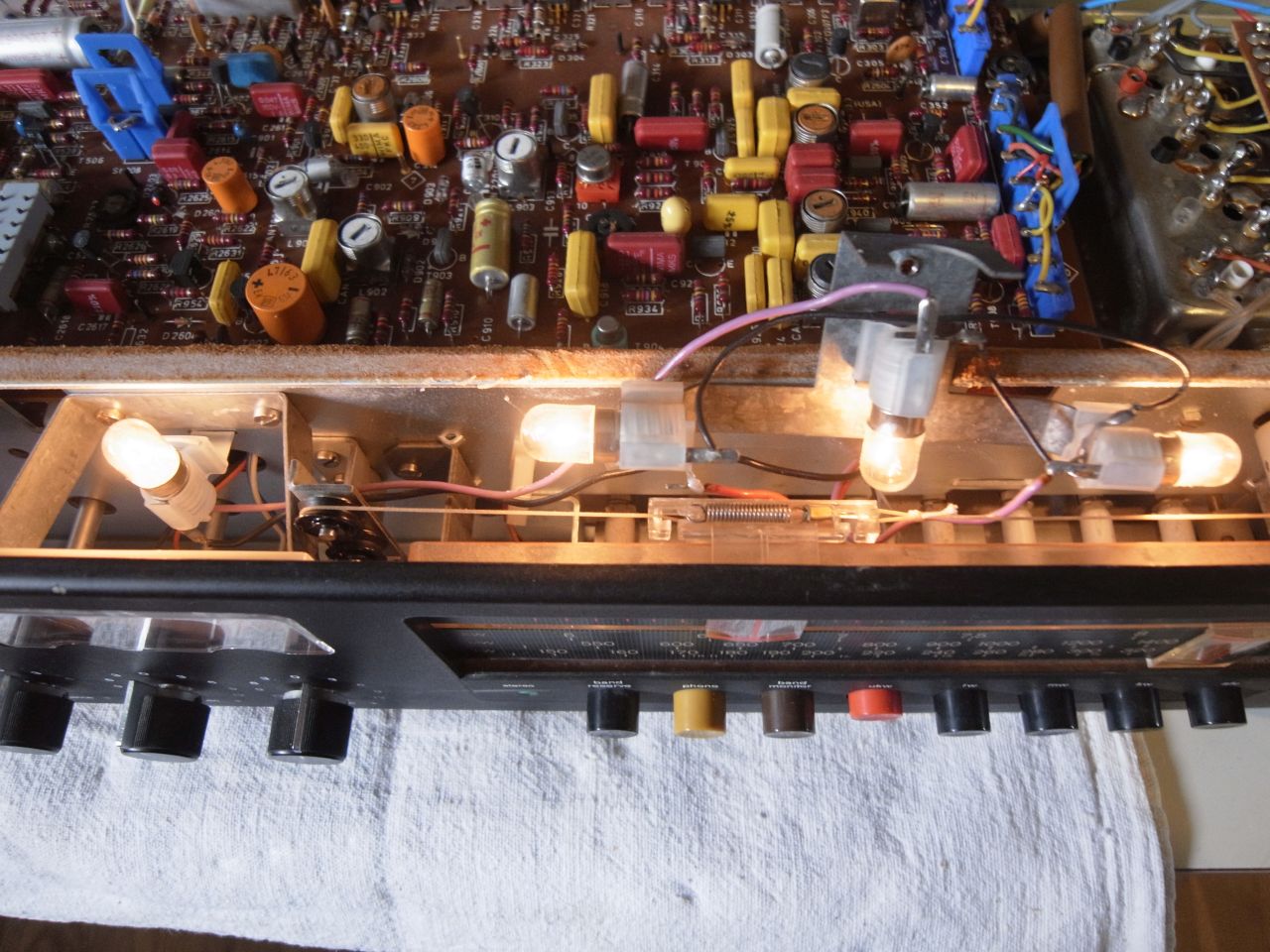 nachdem ich vor einer Woche für einen sehr guten Preis (34€) einen sauberen CEV520 ergattern konnte, gibt es jetzt ein elektrisches Problem. Auf den über 13 Seiten hier im Forum zum Thema "Regie" konnte ich 'ne Menge über die beiden Geräte 510/520 und deren Defekte lesen. Doch der Defekt an meinem Gerät ist nicht erwähnt. Irgendwie kann ich mir die Sache auch nicht logisch erklären, was hier nicht stimmt. Trotz dem Ersatz von neuen Skalenlämpchen 12V 0,1A leuchten nur zwei. (Siehe Foto!) Doch warum? Die in Reihe geschalteten Lämpchen haben alle Durchgang incl. der Verdrahtung.