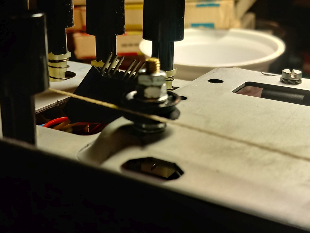 Mein Skalenseil ist wieder da wo es hin soll. Ich mußte es aber leider ersetzen da es durch die schiefen Rollen beschädigt war und beim auflegen gerissen ist. Zum Glück hatte ich noch ein altes aus einem Röhrenadio da das ich angepasst habe. Die Sache mit den Umlenkrollen hat mir so wie Braun das gemacht hat nun gar nicht gefallen. Ich hab sie kurzerhand entfernt und durch 3mm Schrauben die als Stehbolzen fungieren ersetzt. Nun ist alles Präzise geführt und hält auch.
