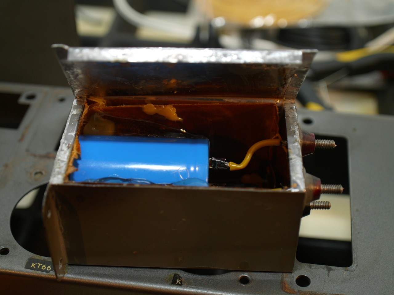 Sie haben die Bezeichnung C609 und C709 - jeweils 2500 µF, 50 V (laut Ersatzteilliste). Die heutigen Elkos sind von der Bauform kleiner, auch wenn Du 63 V-Typen nimmst. Eine Möglichkeit wäre, die alten Becher zu "entkernen", um darin mit z.B. schwarzer Dichtungsmasse die neuen Teile einzupflanzen. Habe ich schon mal auf einer Seite zur Restauration von Radio-Oldtimern gesehen.