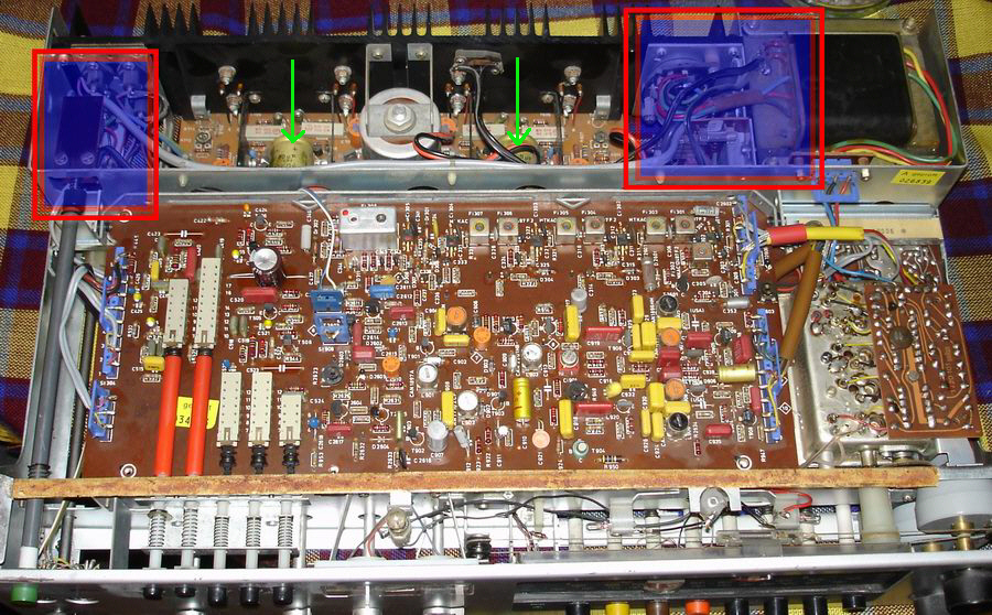 Die beiden fraglichen Elkos sollten die mit den grünen Pfeilen markierten sein. Den Beitrag zu den restaurierten Roederstein Elkos habe ich jetzt auch nicht gefunden.