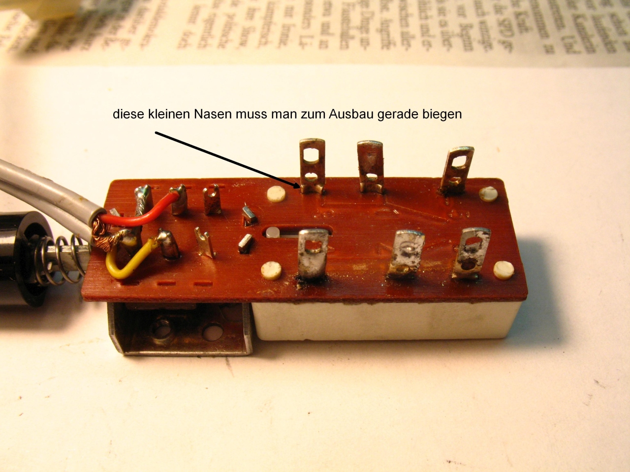 2. Die 6 oben aus dem Schaltergehäuse ca 2mm herausschauenden Stifte der Schaltkontakte gerade biegen