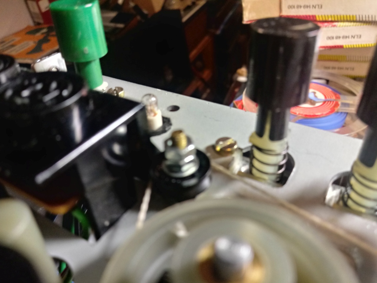 Mein Skalenseil ist wieder da wo es hin soll. Ich mußte es aber leider ersetzen da es durch die schiefen Rollen beschädigt war und beim auflegen gerissen ist. Zum Glück hatte ich noch ein altes aus einem Röhrenadio da das ich angepasst habe. Die Sache mit den Umlenkrollen hat mir so wie Braun das gemacht hat nun gar nicht gefallen. Ich hab sie kurzerhand entfernt und durch 3mm Schrauben die als Stehbolzen fungieren ersetzt. Nun ist alles Präzise geführt und hält auch.