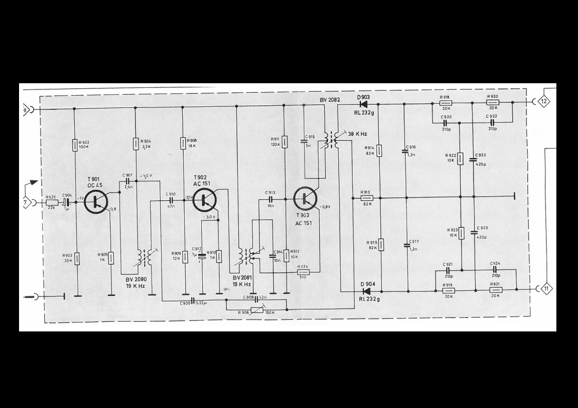 hier ein Foto von einem TD 15 und der dazu passende Auszug aus den Serviceunterlagen für den CET15. Leider funktioniert mein TD 15 (Ersatzteil aus einem Schlachtgerät) nicht; die 19 KHz-Spule mit der Bauvorschrift 2080 ist defekt. Ein Drähtchen ist abgerissen und mir scheint, dass auch schon einige Windungen abgewickelt wurden.