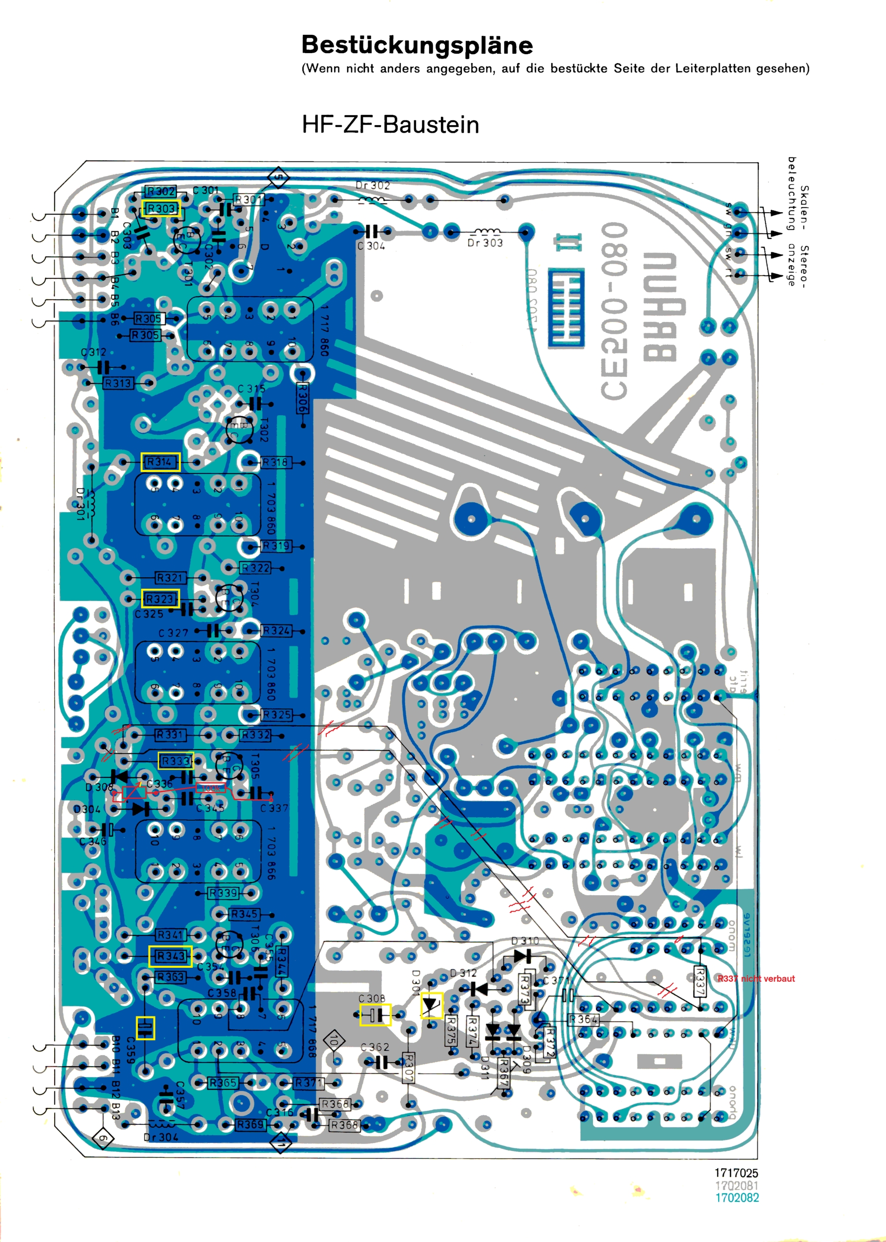 Und hier der Bestückungsplan . Gelb die Messpunkte und ja auch hier abweichende Bestückung bzw. fehlende Verbindungen ( insbesondere Mono/Stereo Umschalter)