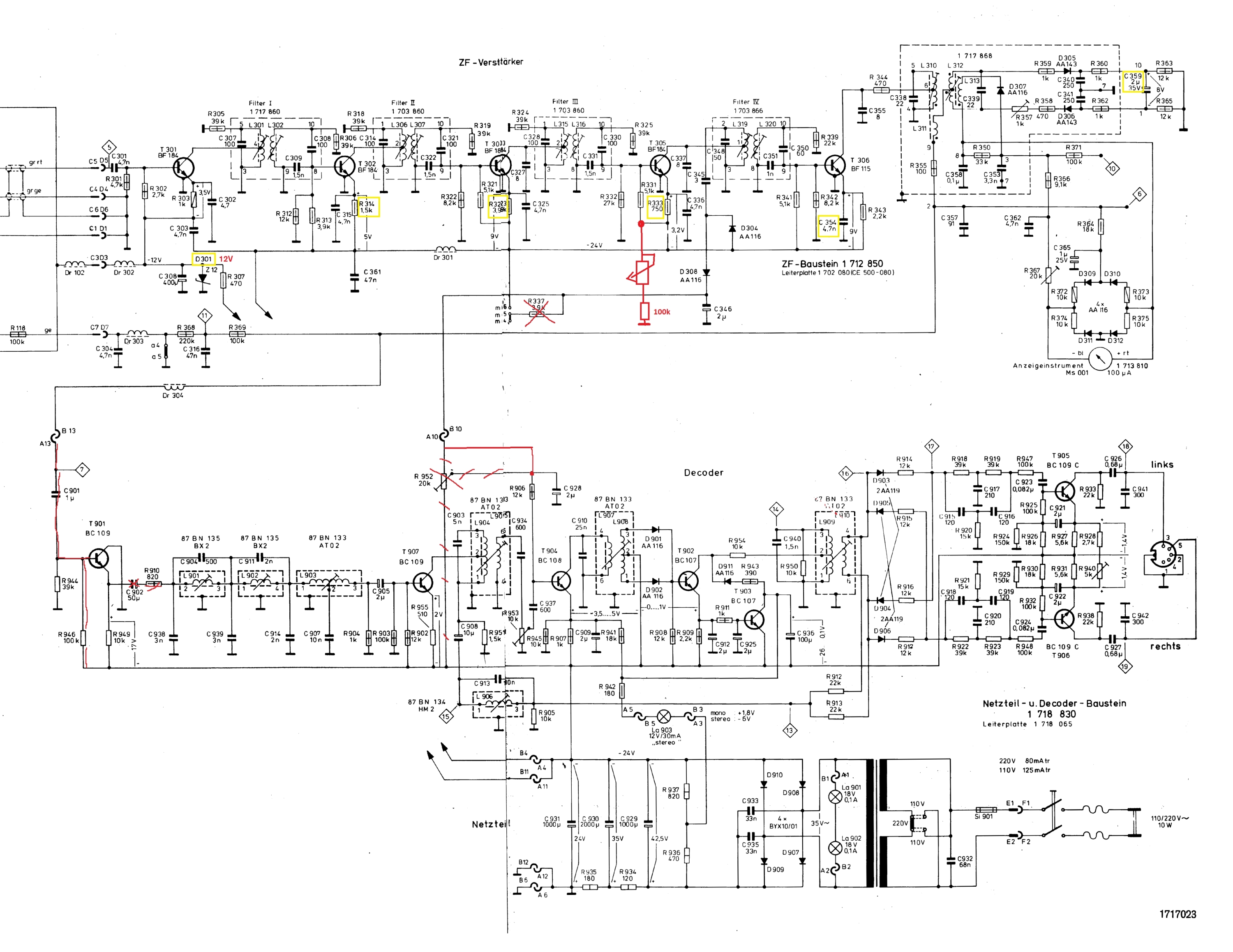 Die Abweichungen in den Schaltplänen verwirren mich sehr. Die Pins des Mon/Stereo Umschalter 5/6) am ZF-Verstärker werden auch gesondert auf den Dekoder geführt (Stecker in der MItte des Dekoderboards Pin A7 und A9) und gehen nicht über R337 (nicht verbaut) an A10. An R333 ist zusätzlich ein Poti mit einem R100k an Masse angeschlossen. (Siehe Schaltplan)