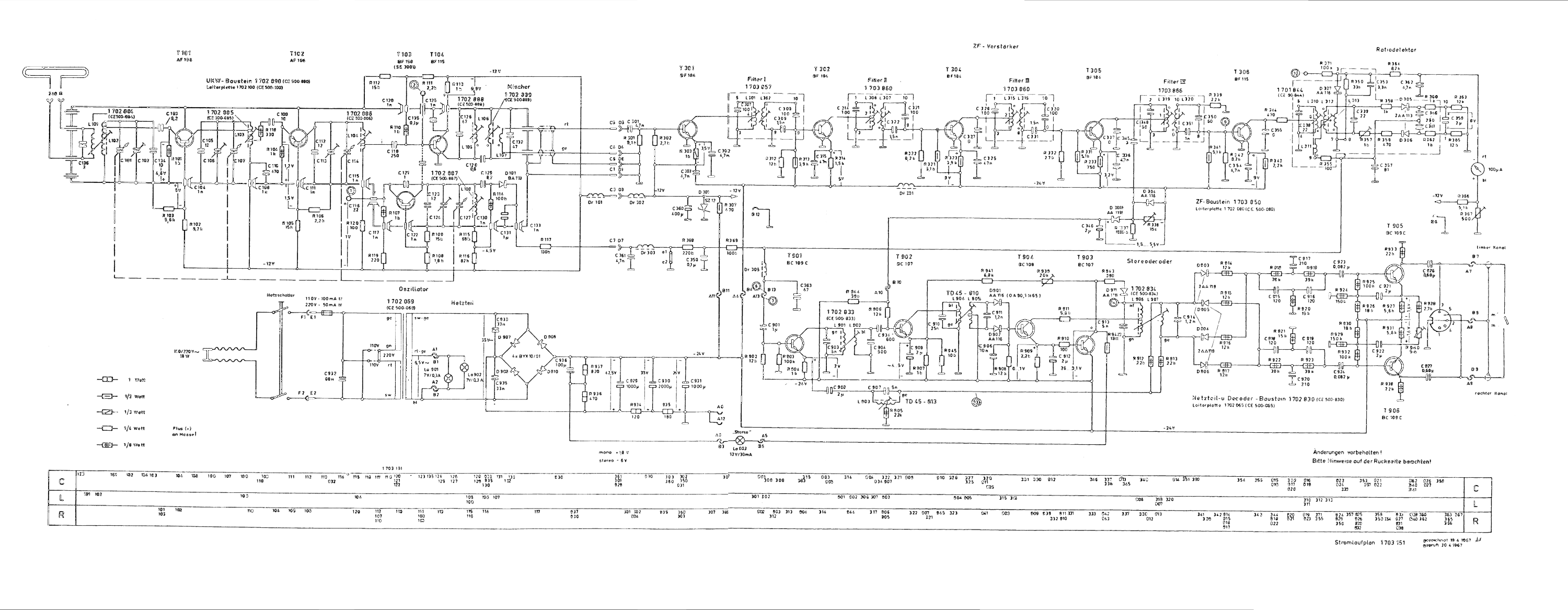 Allerdings leuchtet die Stereokontrolleuchte nicht, obwohl das Birnchen i.O. ist und die Sender gut hereinkommen. Dem Höreindruck nach ist das Ausgangs-Signal nicht Stereo. Die kritischen Elkos waren auch im Decoder schon getauscht. Für den CE 251 gibt es zwei verschiedene Stereodecoder, einen mit 6 Transistoren (1 702 830) und einen mit 7 Transistoren (1 718 830). Ich habe die alte Variante mit 6 Transistoren. Zur Einstellung des Schwellwertes für die Anzeigelampe gibt es dort das Trimmpotentiometer R939 - dieses gibt es bei meinem Gerät aber gar nicht (war nie verbaut!), obwohl die Platine dafür vorgesehen ist. Da das Gerät aber sicher funktionsfähig ausgeliefert wurde und Stereo nicht decodiert wird, liegt die Ursache des Problems wohl nicht bei der Einstellung des Schwellwertes für die Lampe.
