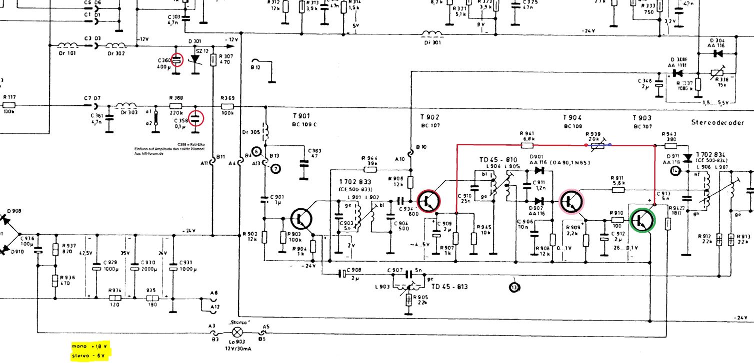 Das enthaltene 19khz Pilotsignal wird dabei auch verwendet, um über die Transistorsstufe T902 (rot) , T904 (rosa) ein ausreichend starkes Signal zu erzeugen, dass schlussendlich T903 (grün) zum Durchschalten seiner Kollektor-Emitter Strecke annimiert wird. Die Spannung am Kollektor wird damit soweit gegenüber der Spannung am 100uF Kondensator C936 (am Netzteil) reduziert, dass über die Stereo-Lampe (12V 30mA) eine hinreichende Spannung abfällt und somit aufleuchten kann. Lampe hab ich geprüft (heil und richtiger Typ verbaut