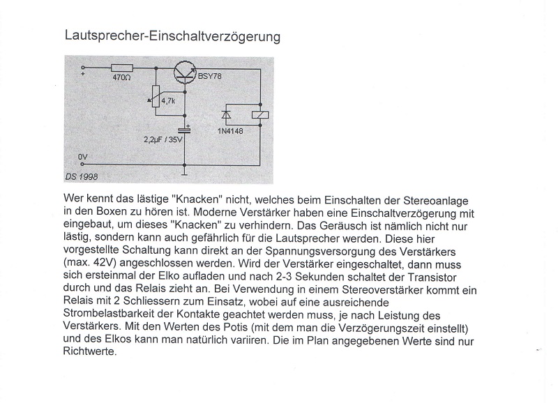 Ich dachte an ein Relais, das alle Lautsprecher unterbricht und erst nach Verzögerung wenn die Elkos geladen sind einschaltet ähnlich wie im Regie 550.
