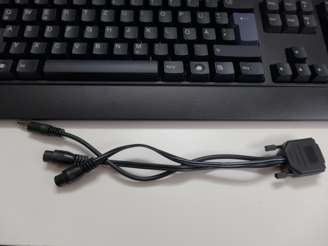 Aus letzterem, zwei Lautsprecher-Kupplungen und einem 3,5mm Klinkenkabel wurde eine Kabelpeitsche gefertigt. Die Spannungsversorgung des Verstärkers erfolgt über ein SATA Y-Kabel, bei dem nur die 12V Schiene angeschlossen ist.